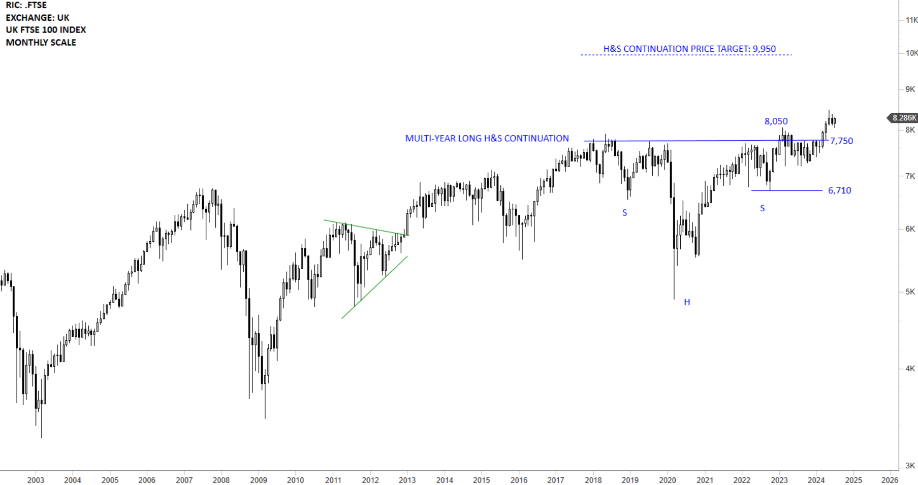 The long-term price chart of UK FTSE 100 Index is completing the multi-month long H&S continuation chart pattern. The horizontal resistance was the neckline at 7,750 levels. This is a monthly scale price chart. April close was strong with a long white candle that cleared the minor high at 8,050 levels. Ideal condition for a strong breakout was met with April’s close above 8,050 levels. Outlook is positive for UK equities. It is important to note that the index is breaking out of a multi-year long consolidation and the confirmed breakout can be followed by multi-year long uptrend. 7,750-8,050 area becomes the new support.
