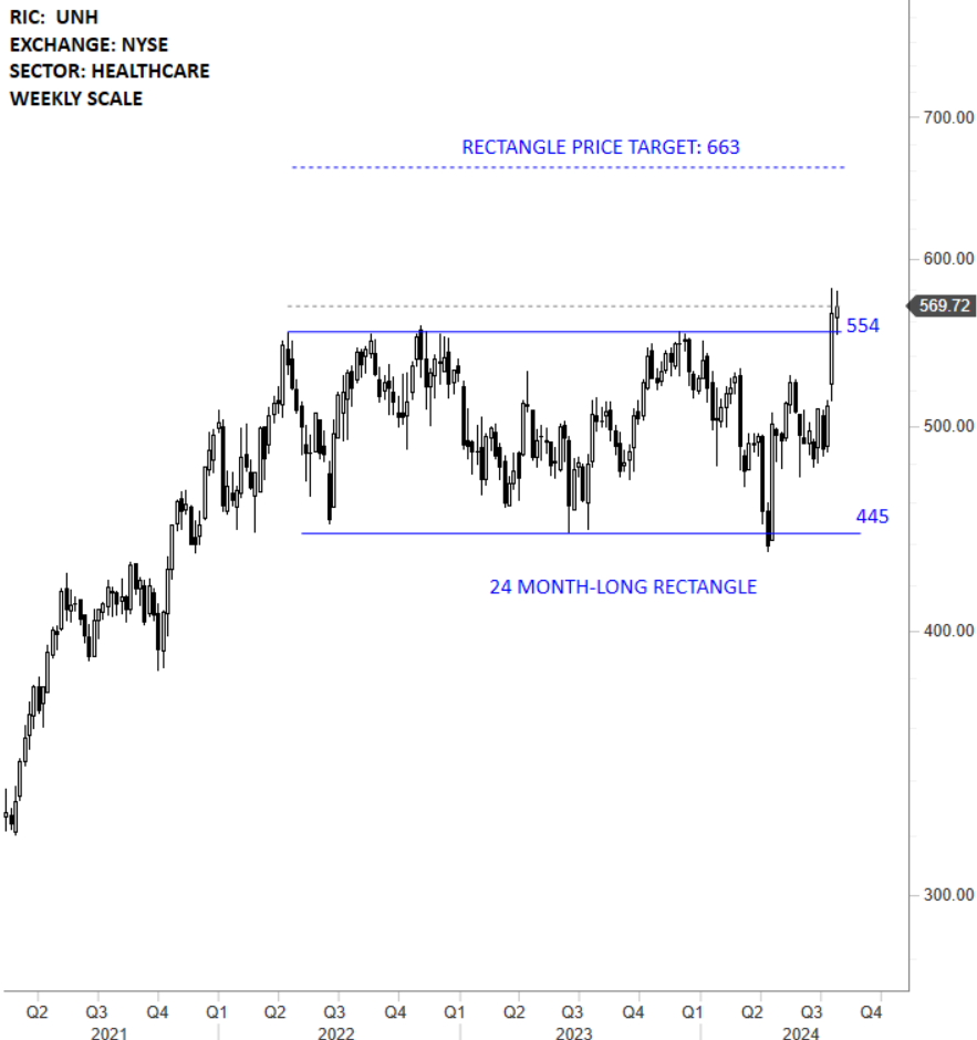 UnitedHealth Group Incorporated is a healthcare company. The stock is listed on the New York Stock Exchange. Price chart formed a 24 month-long rectangle with the horizontal boundary acting as strong resistance at 554.00 levels. The horizontal boundary was tested several times over the course of the chart pattern. A daily close above 570.00 levels will confirm the breakout from the 24 month-long rectangle with the possible chart pattern price target of 663.00 levels. (Learn more: Video Tutorial)