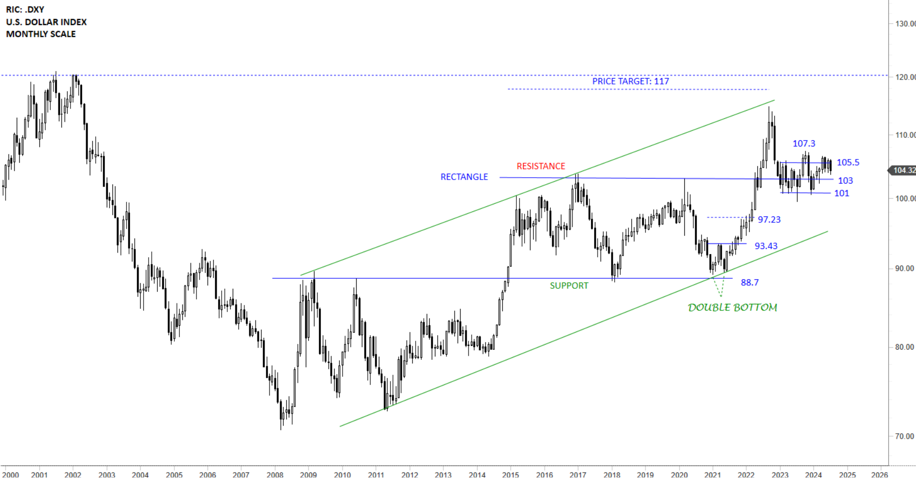 The USD Index is trying to hold above the horizontal support at 103 levels. Better defined range is between 101 and 105.5 levels. For now the price action is range-bound and looking for direction in the medium-term. Minor high at 107.3 levels can act as the neckline of a possible double bottom that can launch a new upward leg towards 117 levels. Only after a breakdown below 101 levels I will start thinking of the bearish possibilities for the USD Index.