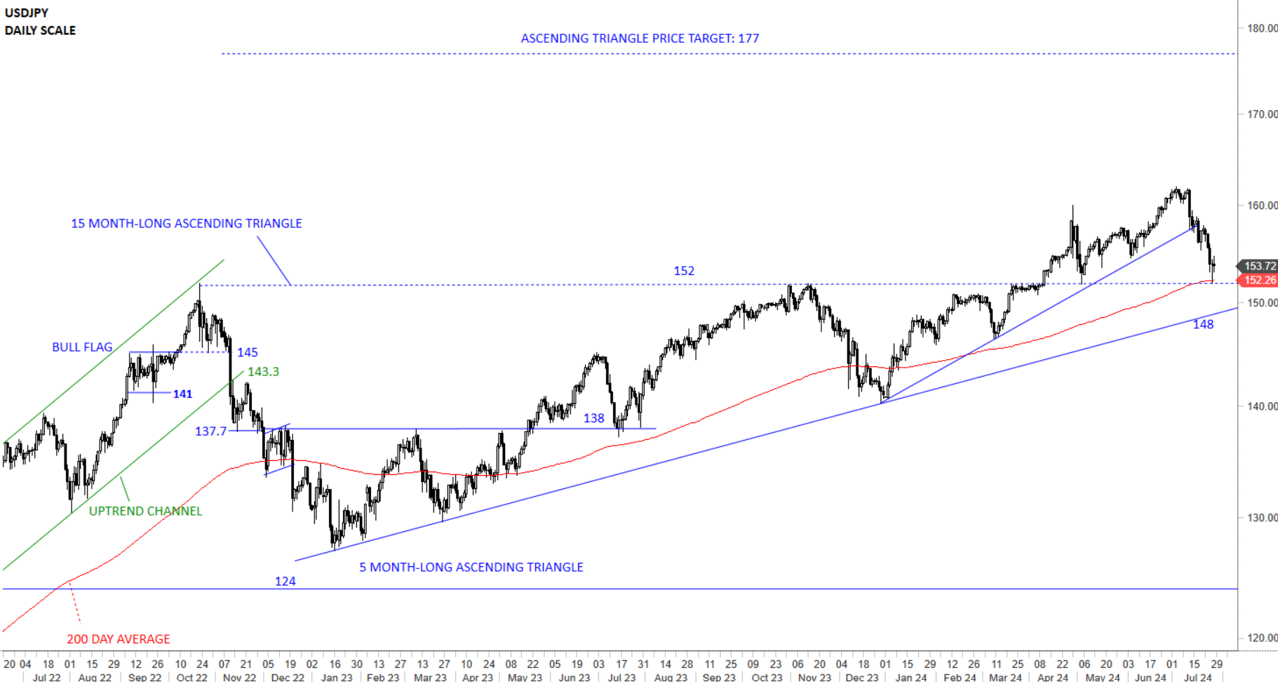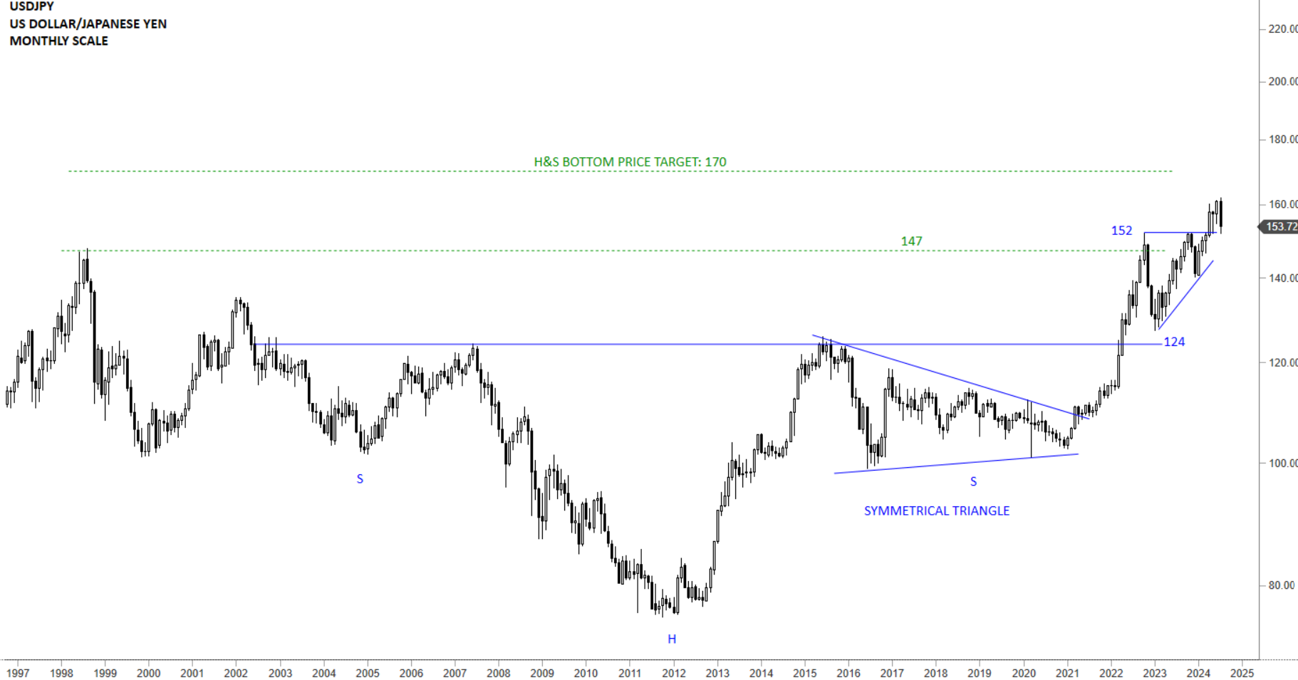 USDJPY completed multi-year long bottom reversal with a breakout above 124 levels. Price action looks more like a strong breakout followed by a sharp pullback and now continuing higher. October 22 high at 152 levels was an important resistance which the pair paused at. USDJPY completed an ascending triangle with the breach above the upper boundary at 152 levels. Latest price action look more like a breakout and an extended pullback.