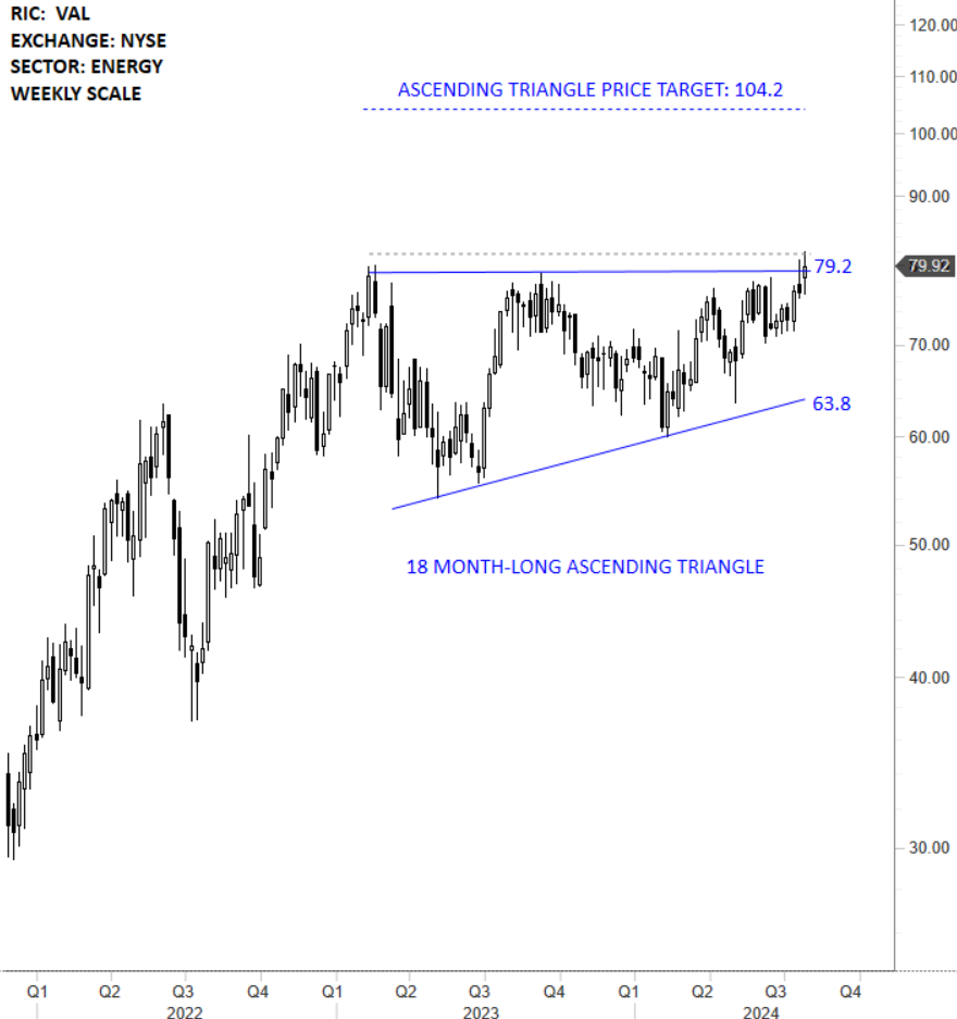 Valaris Limited provides an offshore drilling service. The Company operates a rig fleet of ultra-deepwater drill ships, versatile semisubmersibles and modern shallow water jackups. The stock is listed on the New York Stock Exchange. Price chart formed an 18 month-long ascending triangle with the horizontal boundary acting as strong resistance at 79.20 levels. The horizontal boundary was tested several times over the course of the chart pattern. A daily close above 81.67 levels will confirm the breakout from the 18 month-long ascending triangle with the possible chart pattern price target of 104.20 levels. (Learn more: Video Tutorial)