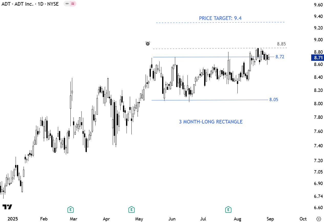 ADT Inc. (NYSE: ADT) is an American provider of residential and small commercial electronic security solutions, offering burglary, fire, carbon monoxide, cybersecurity, video surveillance, access control, and smart‑home services. The stock formed a 3 month-long rectangle with the upper boundary acting as resistance at 8.72 levels. The upper boundary has been tested several times. A daily close above 8.85 levels will confirm the breakout from the rectangle chart pattern with the price target of 9.4 levels. (Learn more: Video Tutorial)