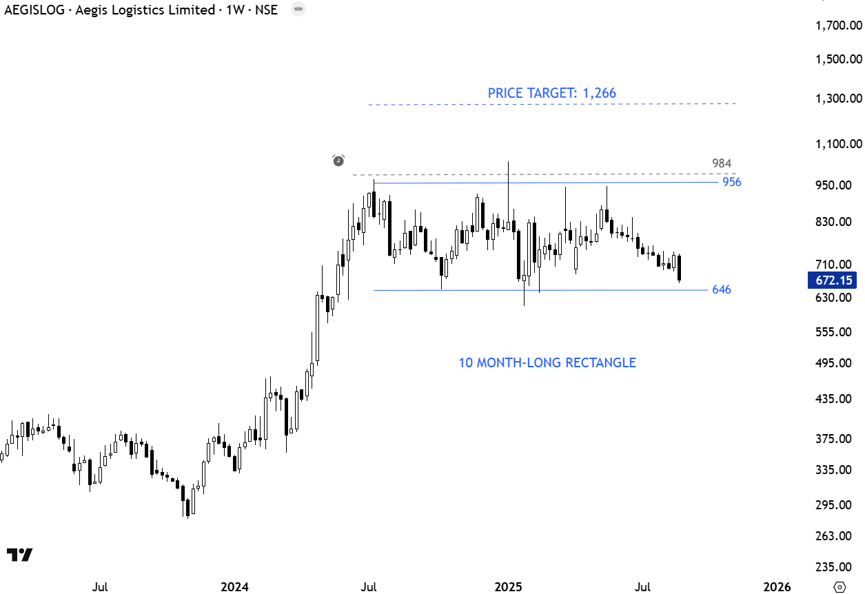 Aegis Logistics Limited is an India-based integrated oil, gas and chemical logistics company. The Company is engaged in the business of the import and distribution of liquified petroleum gas (LPG) and storage and terminalling facilities for LPG and chemical products. The stock is listed on the National Stock Exchange. Price chart formed a 10 month-long rectangle with the horizontal boundary acting as strong resistance at 956.00 levels. The horizontal boundary was tested several times over the course of the chart pattern. A daily close above 984.00 levels will confirm the breakout from the 10 month-long rectangle with the possible chart pattern price target of 1,266.00 levels. (Learn more: Video Tutorial)