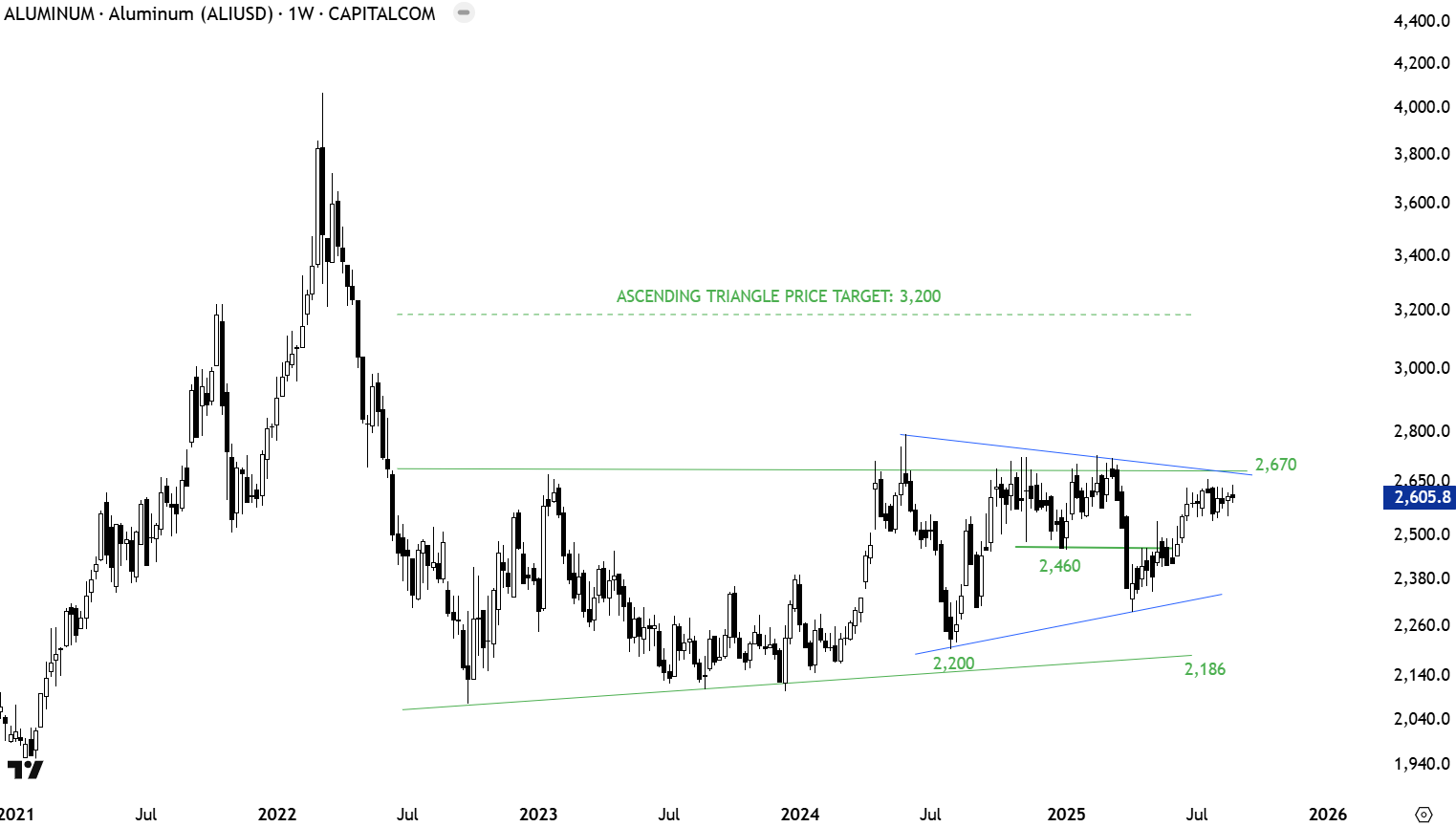 Aluminum futures are forming a possible multi-year long ascending triangle. The upper boundary was tested several times around 2,670 levels. Only after a breakout above 2,670 levels we will discuss the completion of the multi-year long ascending triangle as a bottom reversal. In that long-term ascending triangle, the symmetrical triangle can act as a launching pattern.