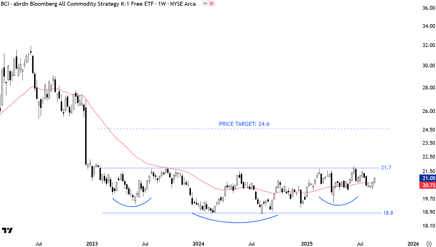 BCI is a commodity ETF tracking a broad-based index, providing exposure to various commodities like energy, metals, and agriculture, without issuing a K-1 tax form, which simplifies tax reporting. Its performance is tied to commodity market trends, which can be influenced by global economic conditions, inflation, and supply-demand dynamics. The chart is possibly forming a 2 year-long bottom reversal that can be identified as a complex H&S bottom. The neckline is at 21.7 levels. A daily close above 22.3 levels can confirm the bottom reversal with the price target of 24.7 levels. It is important to note that completion of the multi-year long bottom can be the beginning of a longer-term uptrend in commodities. For that reason I would like to see a decisive weekly close above the several times tested upper boundary.