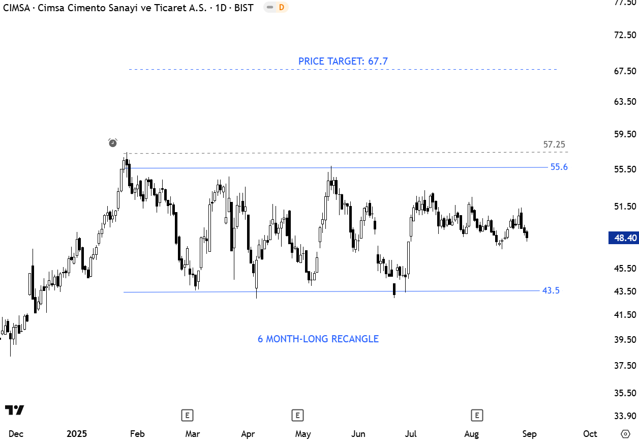 Cimsa Cimento (BIST: CIMSA) is one of Turkey’s leading cement and building materials producers. Founded in 1972 and headquartered in Mersin, Çimsa operates under the umbrella of the Sabancı Group. The company produces white cement, grey cement, calcium aluminate cement, and other specialty products. The stock has formed a 6 month-long rectangle chart pattern with the several times tested horizontal resistance at 55.6 levels. A daily close above 57.25 levels will confirm the breakout, potentially triggering a move toward the price target of 67.7. (Learn more: Video Tutorial)