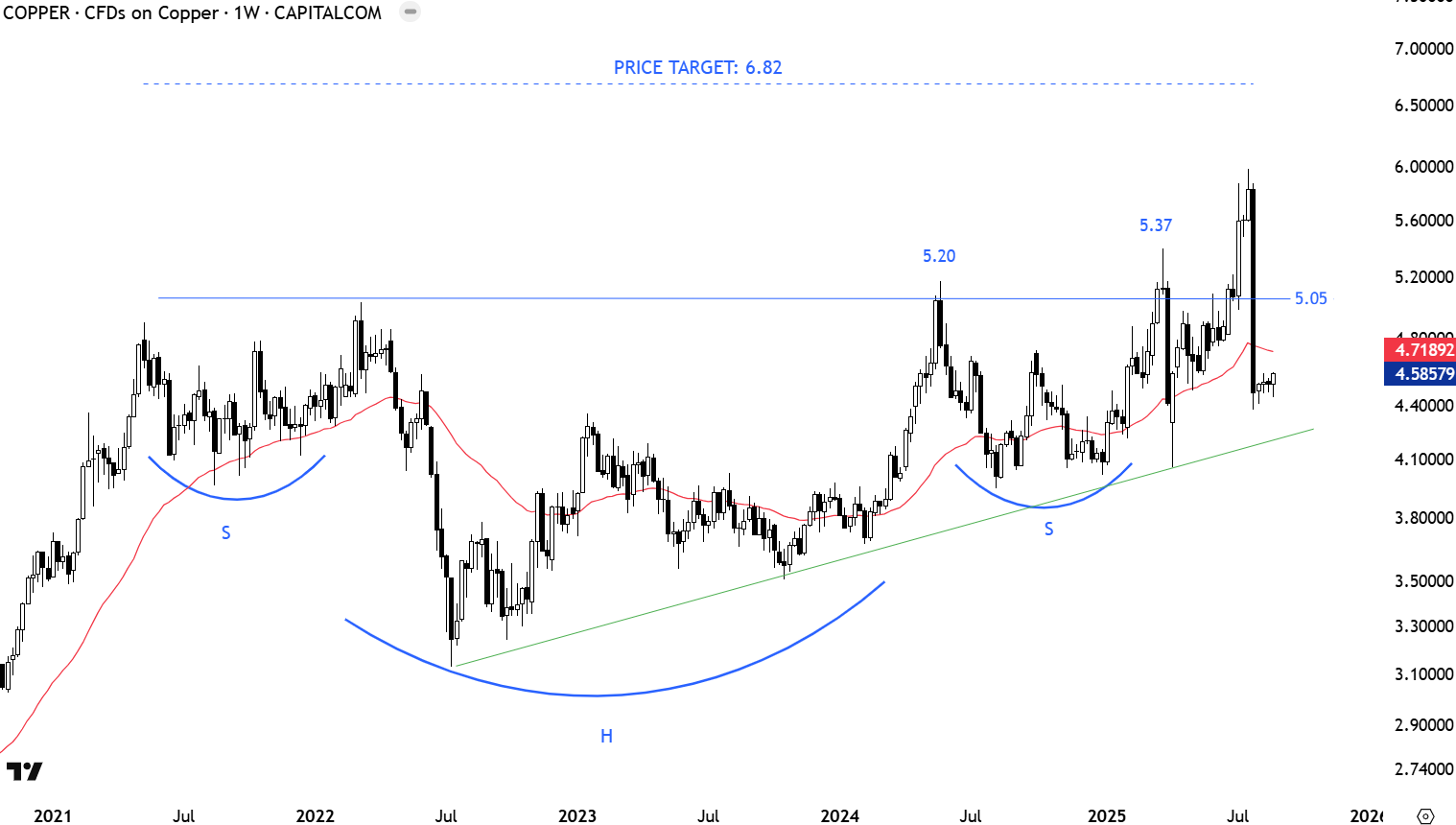 Due to exposure to frequent news flow, Copper is experiencing increased volatility around the pattern boundary at 5.05 levels. A possible long-term H&S continuation might be completing with the breakout above the neckline at 5.05 levels. The weekly close above 5.20-5.37 resistance area confirmed the long-term H&S continuation breakout. Price target for the multi year-long H&S continuation stands at 6.82 levels. The weekly close was very weak and well below the pattern boundary, though still above the pattern negation level, the low of the right shoulder at 4.0 levels. Since July 2022, Copper price is forming higher lows that can be seen from the green upward sloping trend line.