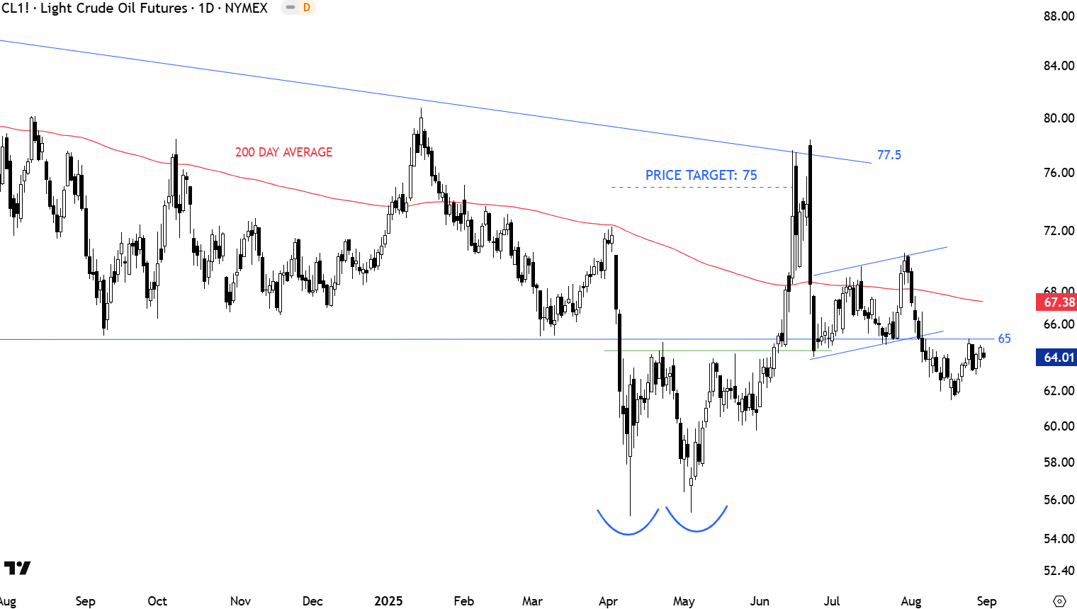 Crude Oil’s long-term pattern confirmed as a descending triangle (bearish chart pattern) with a breakdown below the horizontal support at 65 levels. However after 2 months of consolidation price formed a short-term double bottom. Breakout above 65.2 levels confirmed the double bottom reversal. The recovery above 65 was an anticipation for the recent Geopolitical tension. Double bottom price target was met. Failure to hold above 65 levels can result in a re-test of April-May lows around 55 levels. 65 levels turns into resistance. A sharp recovery above 65 levels can quickly test the year-long average at 67.38 levels.