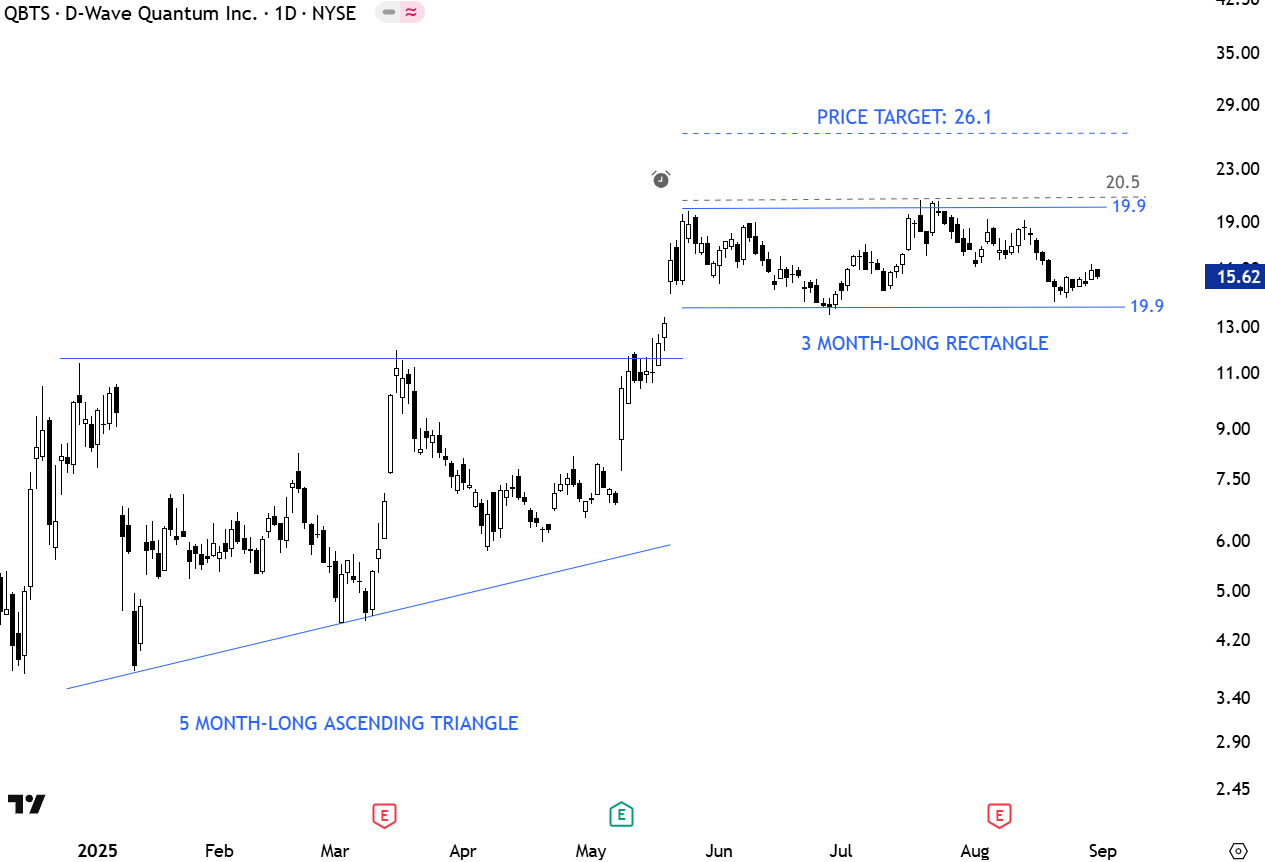 D-Wave Quantum Inc. (NYSE: QBTS) is a Palo Alto–based quantum computing company, founded in 1999 and publicly listed via SPAC in 2022. It’s the first commercial supplier of quantum computers, specializing in annealing-based systems like the Advantage and Advantage2, plus cloud services (Leap), open-source software (Ocean), and application onboarding (Launch). D-Wave serves Fortune 2000 clients in optimization, AI, logistics, and materials science, and is the only firm developing both annealing and gate-model systems. The stock is listed on the New York Stock Exchange. Price chart formed a 3 month-long rectangle with the horizontal boundary acting as strong resistance at 19.9 levels. The horizontal boundary was tested several times over the course of the chart pattern. A daily close above 20.5 levels will confirm the breakout from the 3 month-long rectangle with the possible chart pattern price target of 26.1 levels. (Learn more: Video Tutorial)