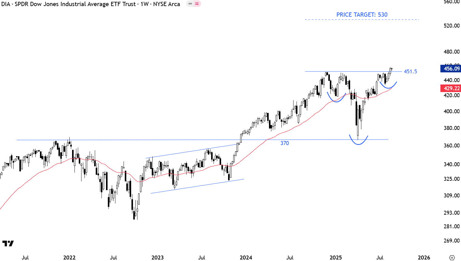DIA rebounded from the strong support at 370 levels. Recovery above the year-long average and continued strength targeted the next resistance at 451.5 levels. The ETF is possibly completing a H&S continuation with the breach of the neckline at 451.5 levels. Given the length of the pattern another strong weekly close above the neckline can offer a higher probability confirmation with the chart pattern price target of 530 levels. Outlook is improving.
