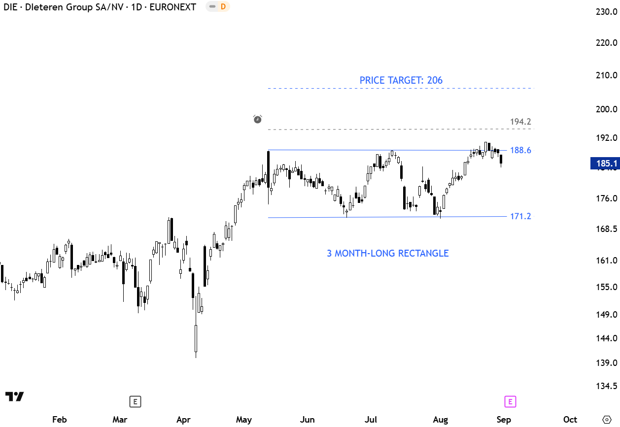 D’Ieteren Group SA/NV is a long-established, family-controlled Belgian investment holding company, founded in 1805 and headquartered in Brussels. D’Ieteren Group connects automotive distribution, vehicle services, parts supply, lifestyle goods, and real estate into a coherent investment structure with global reach and strong market positions. The stock is listed on EuroNext. Price chart is possibly forming a 3 month-long rectangle with the upper boundary acting as resistance at 188.6 levels. There has been several tests of the horizontal boundary. A daily close above 194.2 levels will confirm the rectangle as a bullish continuation with the price target of 206 levels. (Learn more: Video Tutorial)