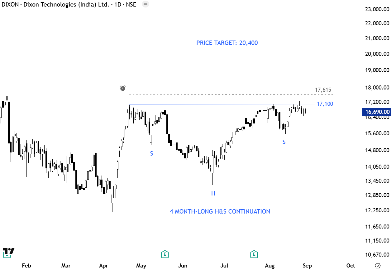 Dixon Technologies (India) Ltd. engages in the manufacture and sale of electronic products. The firm offers consumer electronics such as LED television, home appliances such as washing machines and lighting products such as LED bulbs and tube lights, down lighters, and compact fluorescent bulbs and mobile phones. It also provides after sales services. Price chart possibly formed a 4 month-long H&S continuation with the horizontal boundary acting as resistance at 17,100 levels. A daily close above 17,615 levels will confirm the breakout from the bullish continuation chart pattern with the price target of 20,400 levels. (Learn more: Video Tutorial)