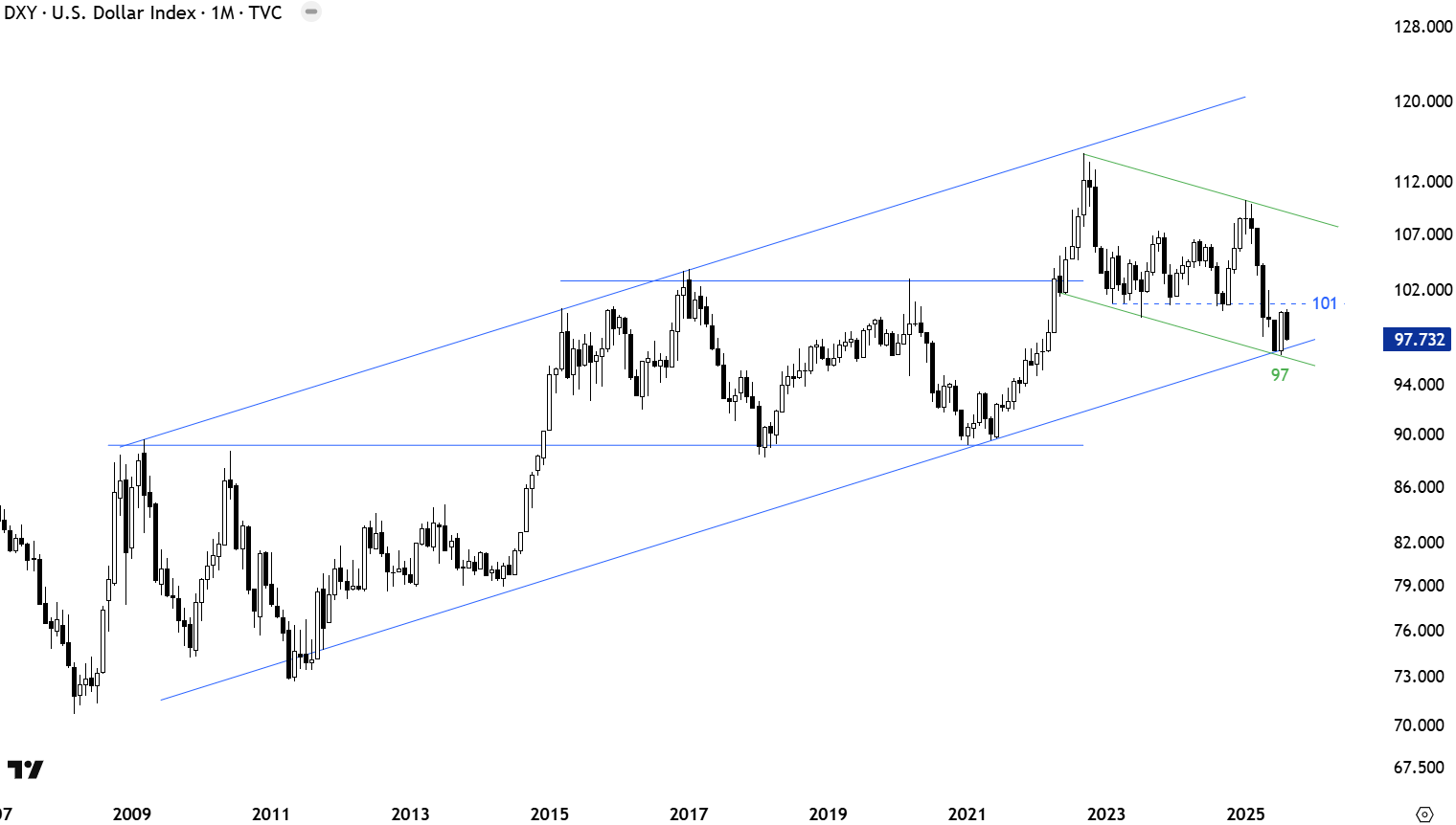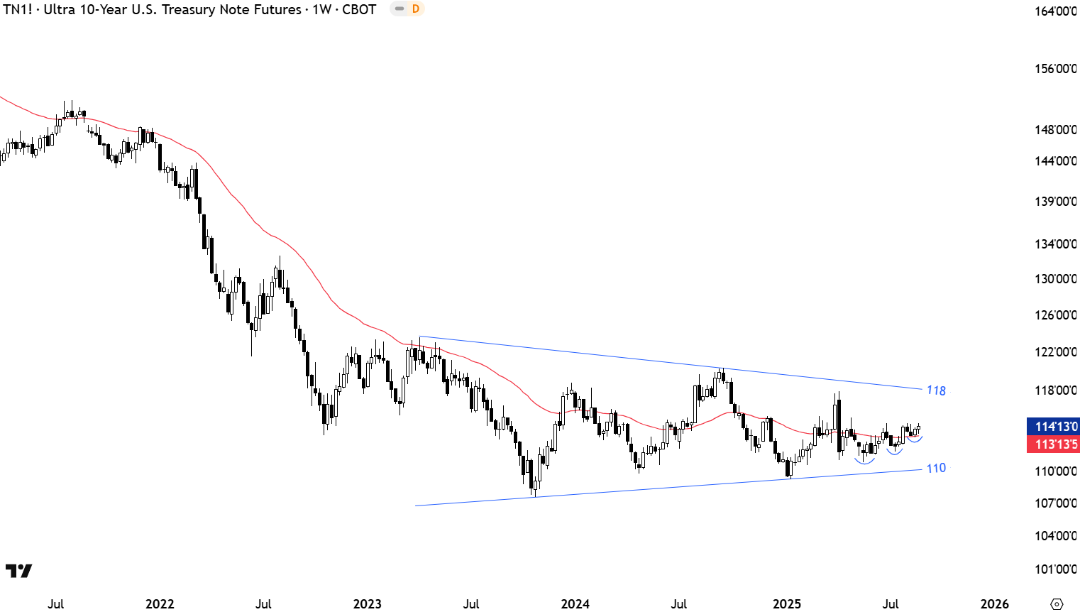 The U.S. 10 Year T-Note might be forming a long-term symmetrical triangle with the lower boundary acting as support at 110 and the upper boundary as resistance at 118 levels. Price can remain volatile in this range in the following weeks.