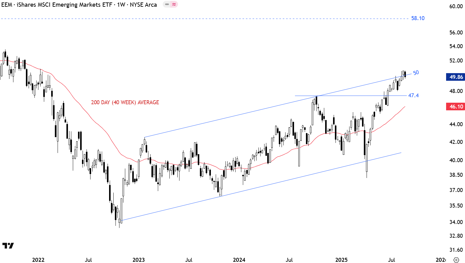 The iShares MSCI Emerging Markets Index ETF (EEM) rallied from the lower boundary of its trend channel. Price is above its year-long average. Strong short-term resistance was cleared at 47.4 levels. Previous resistance at 47.4 becomes the new short-term support. The upper boundary of the trend channel at 50 levels was tested after the breakout above 47.4 levels. Last week’s strength cleared the upper boundary at 50 levels thanks to the strong performance from China equities. Breakout above 50 levels can accelerate the uptrend in Emerging Markets. 47.4 levels will continue to act as support.