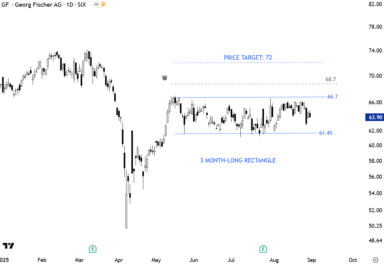 Georg Fischer (GF) is a leading global provider of flow solutions for transporting water, chemicals, and gases safely and efficiently across industrial, infrastructure, and building sectors. Originally founded as a steel foundry, GF has transformed over two centuries into a modern technology group focused on sustainability, innovation, and precision engineering. The stock is listed on the Swiss Stock Exchange. The stock formed a 3 month-long rectangle with the upper boundary acting as resistance at 66.7 levels. A daily close above 68.7 levels will confirm the breakout from the horizontal chart pattern with the possible chart pattern price target of 72 levels. (Learn more: Video Tutorial)