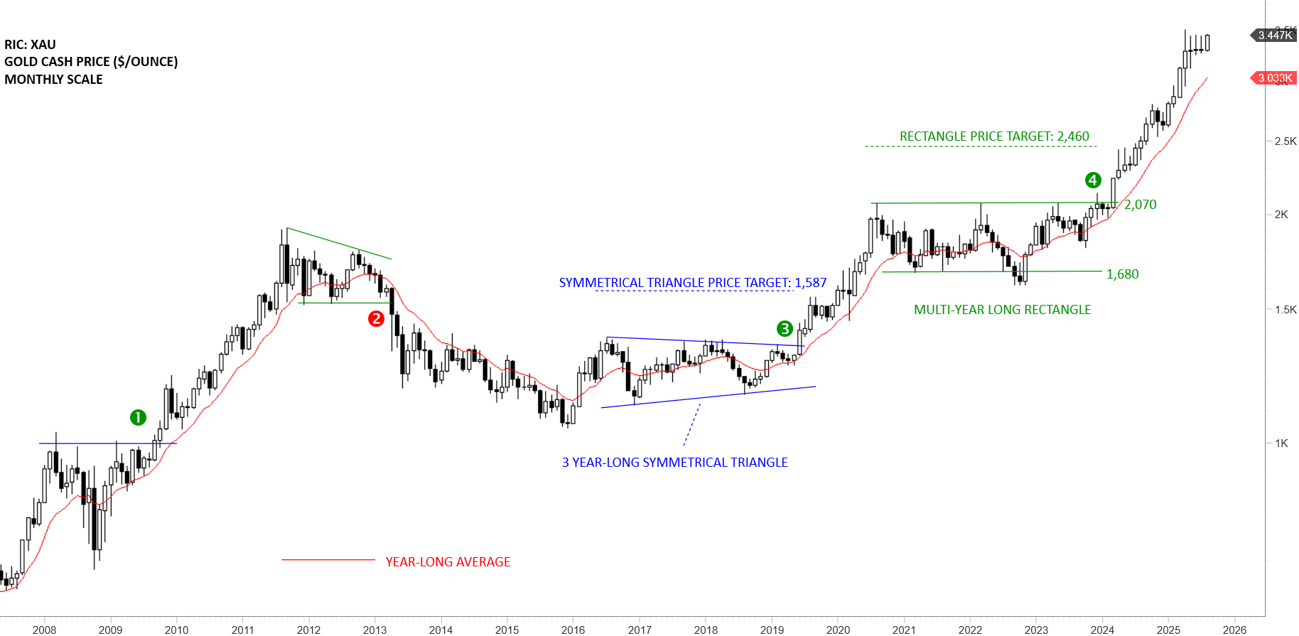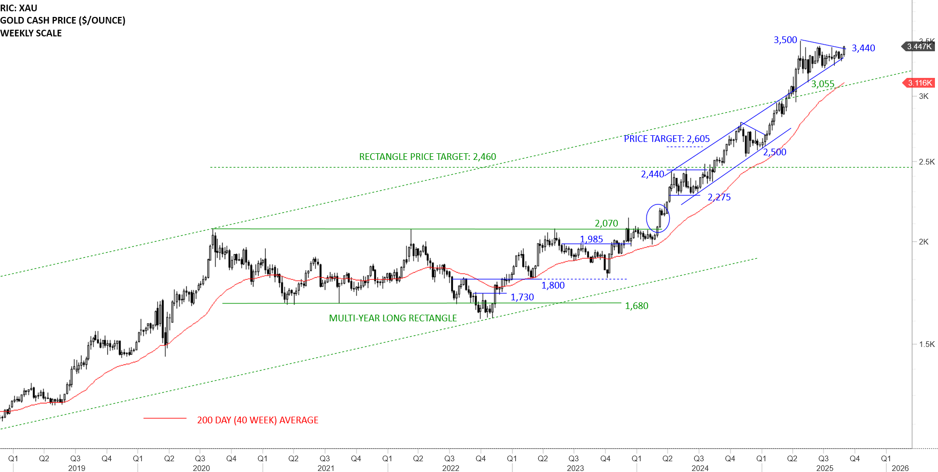 Breakout above 2,070 levels completed a multi-year long rectangle with the price target of 2,460 levels. Given that we are analyzing a monthly scale chart, March 2024 breakout was confirmed with a strong monthly close above the resistance. It is important to note that due to the length of the recent consolidation (multi-year long), breakout possibly started a multi-month long trend. Previous resistance at 2,070 levels becomes the new support. This is considered to be a Type 1 breakout on monthly scale. Type 1 breakouts rally to price objective without any pullback. They usually extend beyond price objective. Price action has become parabolic (steep advance) and the recent weakness/pause comes after the strong advance. 3 month’s sideways consolidation and pause might be coming to an end. September monthly candle can experience a breakout and resume the uptrend.