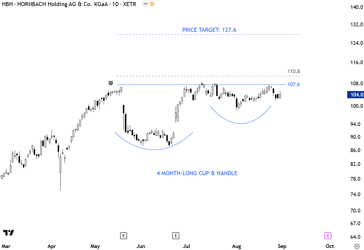 HORNBACH Holding AG & Co. KGaA engages in the development and utilization of retail real estate properties. It operates through the following business segments: HORNBACH Baumarkt AG, HORNBACH Baustoff Union GmbH, and HORNBACH Immobilien AG. The HORNBACH Baumarkt AG segment focuses on operating DIY megastores with garden centers and online shops. The HORNBACH Baustoff Union GmbH segment includes construction materials and builders’ merchant business. The HORNBACH Immobilien AG segment is involved in developing retail real estate. The stock is listed on Xetra Dax. Price chart formed a 4 month-long cup & handle continuation with the horizontal boundary acting as resistance at 107.6 levels. A daily close above 110.8 levels will confirm the breakout with the possible price target of 127.6 levels. (Learn more: Video Tutorial)