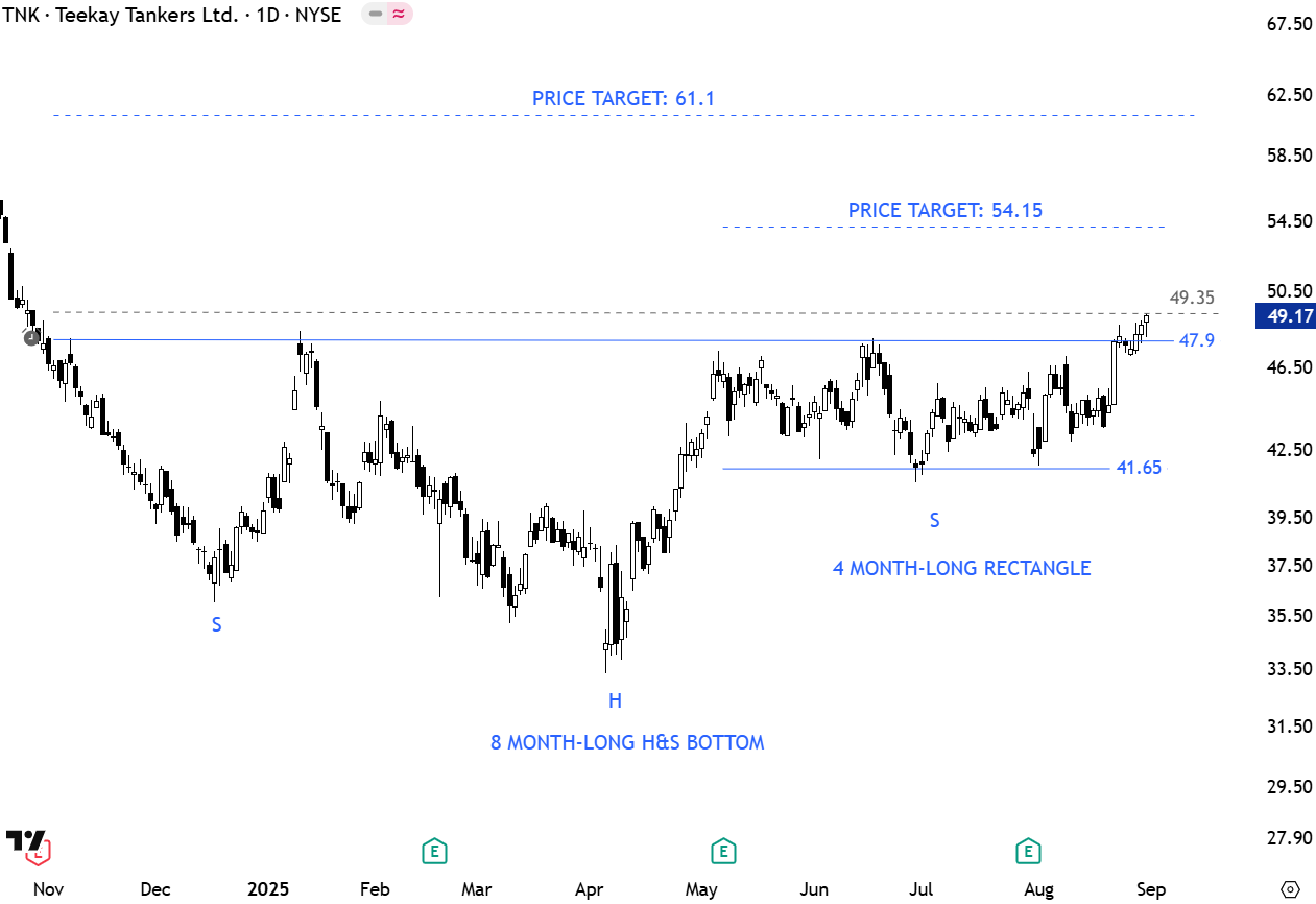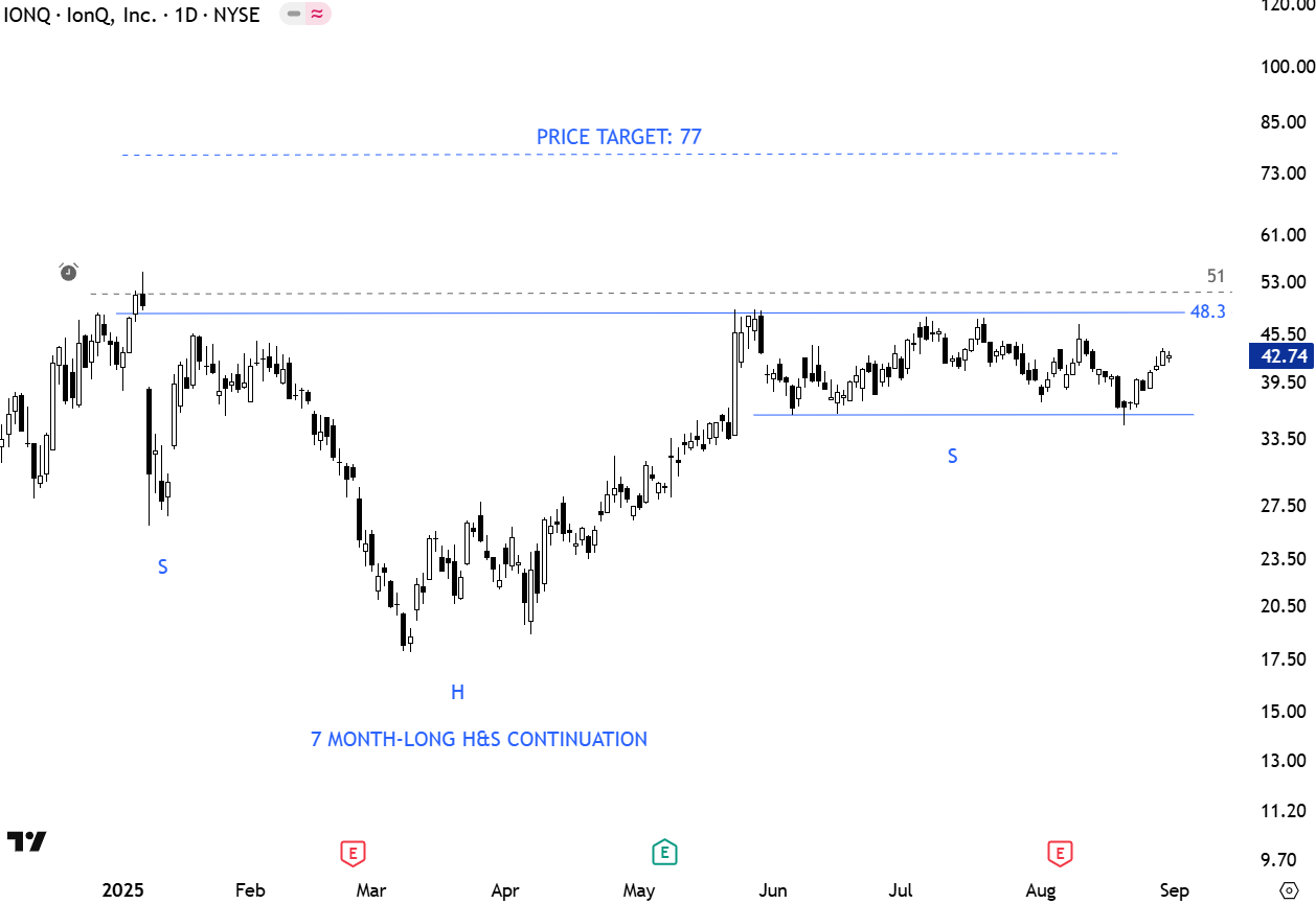 IonQ, headquartered in College Park, MD, is a leading pure-play quantum computing company, specializing in trapped-ion technology for quantum computers. Its systems operate at room temperature with high-fidelity quantum gates, offering a practical alternative to competitors’ superconducting approaches that require extreme cooling. IonQ provides access to its quantum computers via major cloud platforms (Microsoft Azure, Google Cloud, AWS) and its own cloud service, targeting applications in drug discovery, materials science, finance, and AI. The stock formed a 7 month-long H&S continuation chart pattern with the horizontal boundary acting as resistance at 48.3 levels. A daily close above 51 levels will confirm the breakout from the continuation chart pattern with the possible chart pattern price target of 77 levels. (Learn more: Video Tutorial)