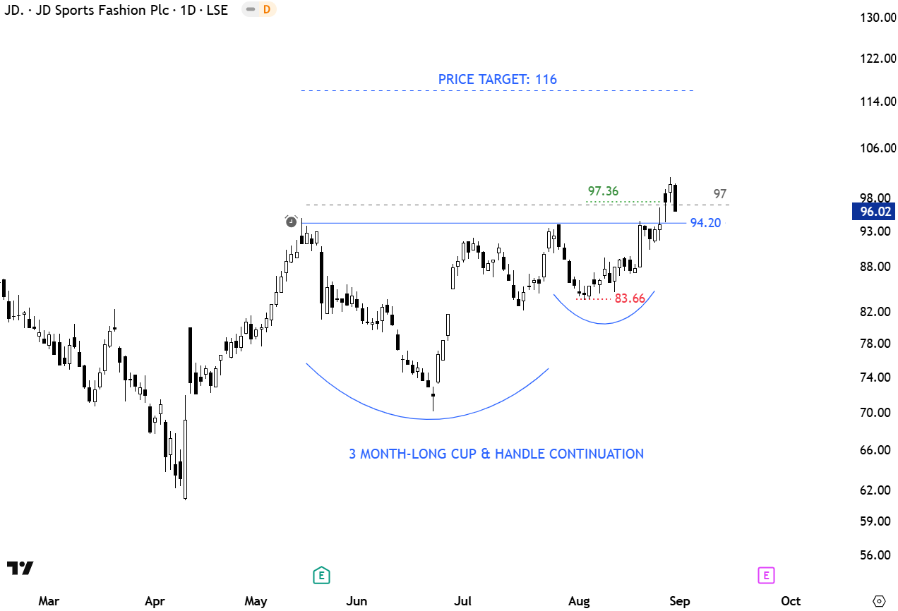 JD Sports Fashion Plc retails and distributes sports fashion wear and outdoor clothing and equipment. It operates through the Sports Fashion and Outdoor segments. The stock is listed on the London Stock Exchange. Price chart possibly formed a 3 month-long cup with handle continuation with the horizontal boundary acting as resistance at 94.2 levels. The daily close above 97 levels confirmed the breakout with the chart pattern price objective at 116 levels. (Learn more: Video Tutorial)