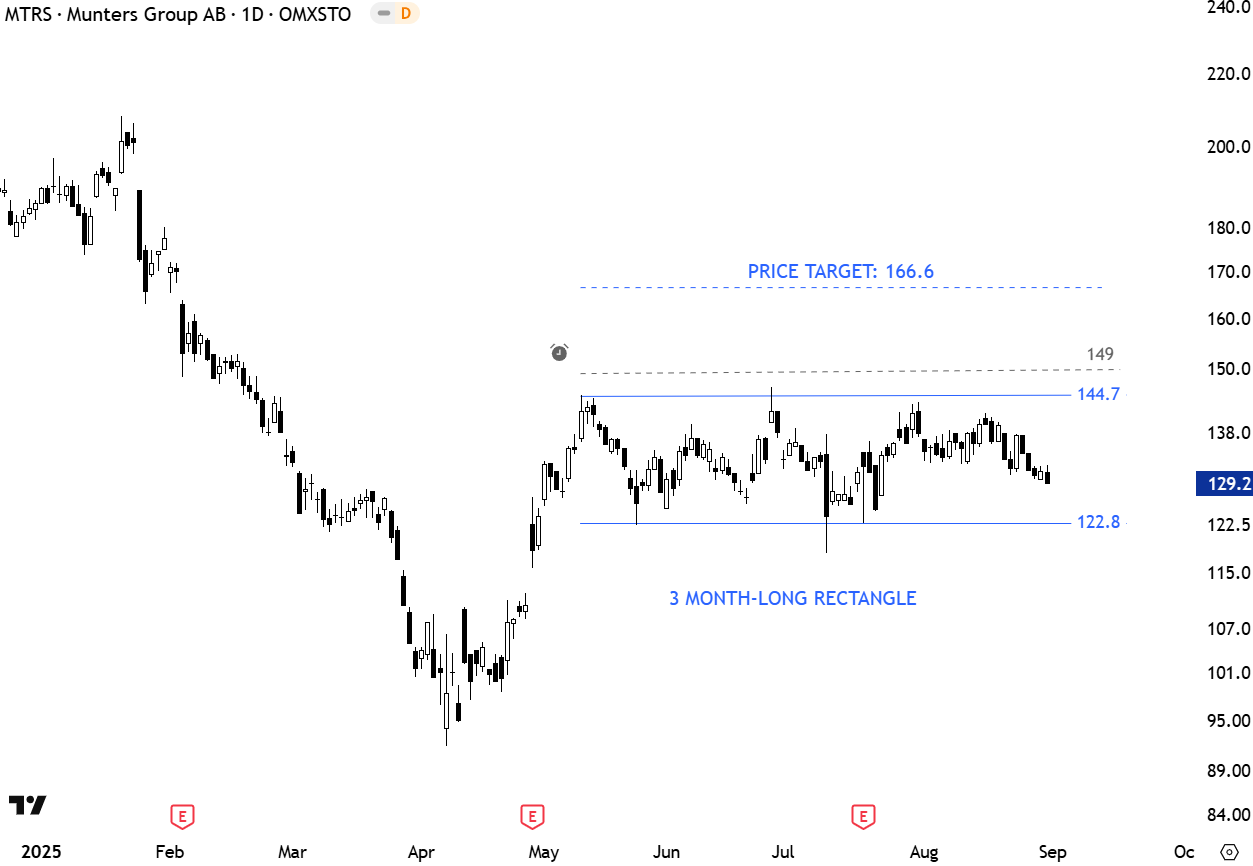 Munters is a global leader in climate control solutions — offering energy-efficient systems that manage humidity, temperature, and air quality for mission-critical environments. Their technologies aim to improve resource efficiency and reduce environmental impact. The stock is listed on the Stockholm Stock Exchange. Price chart formed a 3 month-long rectangle with the upper boundary acting as strong resistance at 144.7 levels. A daily close above 149 levels will confirm the breakout from the horizontal chart pattern with the possible price target of 166.6 levels. (Learn more: Video Tutorial)