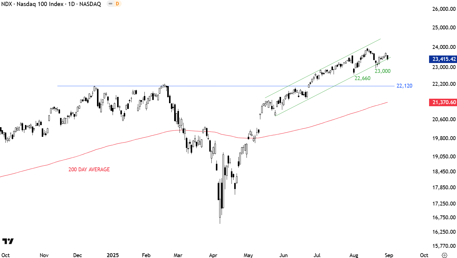 Sharp recovery above the long-term average pushed the index to its all-time highs at 22,120. With price being well above the year-long average, the outlook is positive for Nasdaq. Index cleared the horizontal resistance at 22,120 which now turns into support. The index is resuming higher in a well-defined uptrend channel. The lower boundary of the upward trend channel acted as support first at 22,600 levels and then recently at 23,000 levels. Support area is between 22,120 and 23,000. Breakdown of the uptrend channel can result in short-term weakness.