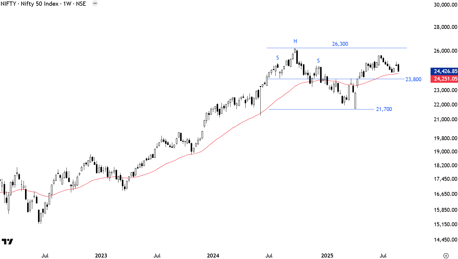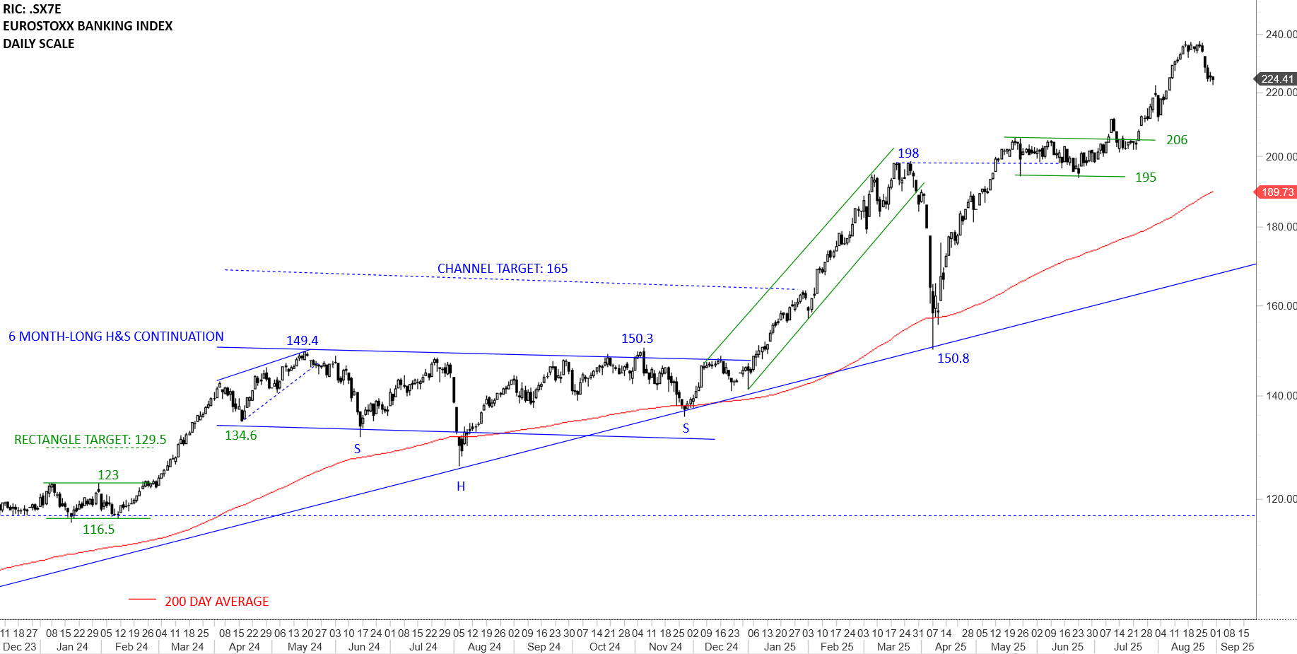 Breakdown of the neckline at 78K for SENSEX resulted in a downtrend towards 71.3K. For Nifty 50 the H&S top price target stood at 21.7K. Both benchmarks came very close to their pattern objectives. The strong weekly close above 23.8K for Nifty 50 was bullish for the index as it recovered above the neckline and the year-long average. Likewise the weekly close above 78K is considered positive price action for Sensex. Short-term sideways consolidations failed to resume uptrends towards 2024 highs. Sensex and Nifty continues to consolidate above the year-long averages in search for a continuation chart pattern. So far price action for both benchmarks can be analyzed as a reversion to the mean. I will monitor possible buyer strength around the 200-day averages after back to back weekly negative closes. Benchmarks might be due for a rebound. Failure to remain above the year-long averages can result in a test of 78K on Sensex and 23.8K on Nifty. There has been debates on the possibility of H&S tops developing on both benchmarks with a downward sloping neckline. Given that the possible neckline and the 200-day averages are overlapping around the same level, I will take a weekly close below the long-term averages as negative.