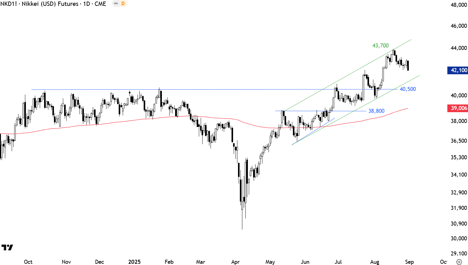 Japan’s NIKKEI 225 index breached the 200-day average and resulted in a sell-off towards support around 30.5K. Sharp rebound cleared the March low at 36K and reached 37.7K, the 200-day average resistance. The 200-day average at 37.7K acted as support and resulted in a short pause (ascending triangle) after the strong rebound. The pattern completed as an ascending triangle. Breakout from the tight consolidation is now resuming the uptrend in a well-defined trend channel. Latest strength also cleared the horizontal resistance at 40,500 levels. Strong support is at 40,500 levels. Latest weakness started from the upper boundary of the channel which shows that both boundaries are recognized by market participants. The lower boundary of the uptrend channel can form support at 41,000 levels.