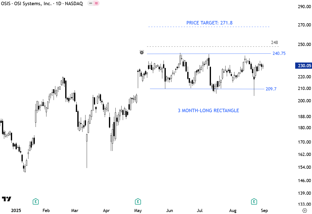 OSI Systems, Inc. (NASDAQ: OSIS), founded in 1987 and headquartered in Hawthorne, California, is a vertically integrated provider of electronic systems for security screening, healthcare, defense, and aerospace. Through its Security, Healthcare, and Optoelectronics & Manufacturing divisions, the company designs, manufactures, and services technologies ranging from airport scanners and patient monitoring systems to custom sensors, serving customers worldwide. The stock is listed on the Nasdaq Stock Exchange. Price chart is possibly forming a 3 month-long rectangle with the upper boundary acting as resistance at 240.75 levels. A daily close above 248 levels will confirm the breakout from the rectangle with the possible chart pattern price target of 271.8 levels. (Learn more: Video Tutorial)