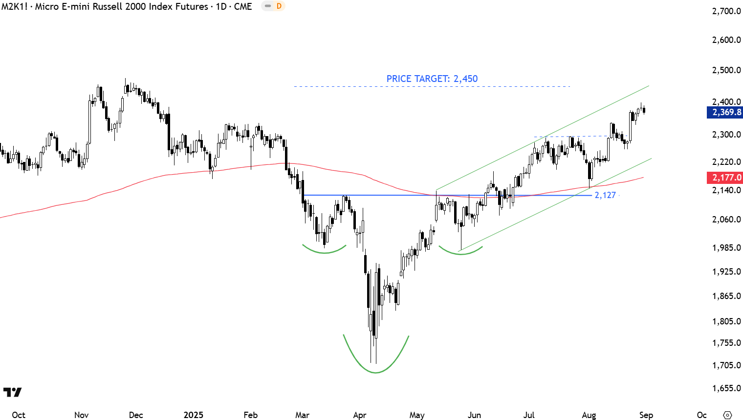 Russell 2000 Index has been a laggard when compared with Tech stocks and Blue chips. After a sharp sell-off and a similar sharp rebound price tested the 200-day average as resistance at 2,127 levels. The minor high was also overlapping as resistance with the long-term average. Breakout above the possible neckline cleared the 200-day average. It was important for the index to stabilize above the 200-day average. H&S bottom negation level is at 1,985 levels (low of the right shoulder). Neckline and the 200-day average becomes the support at 2,127 levels. The index might be forming a possible upward trend channel with the lower boundary acting as support at 2,220 levels. Price target for the H&S bottom reversal stands at 2,450 levels.