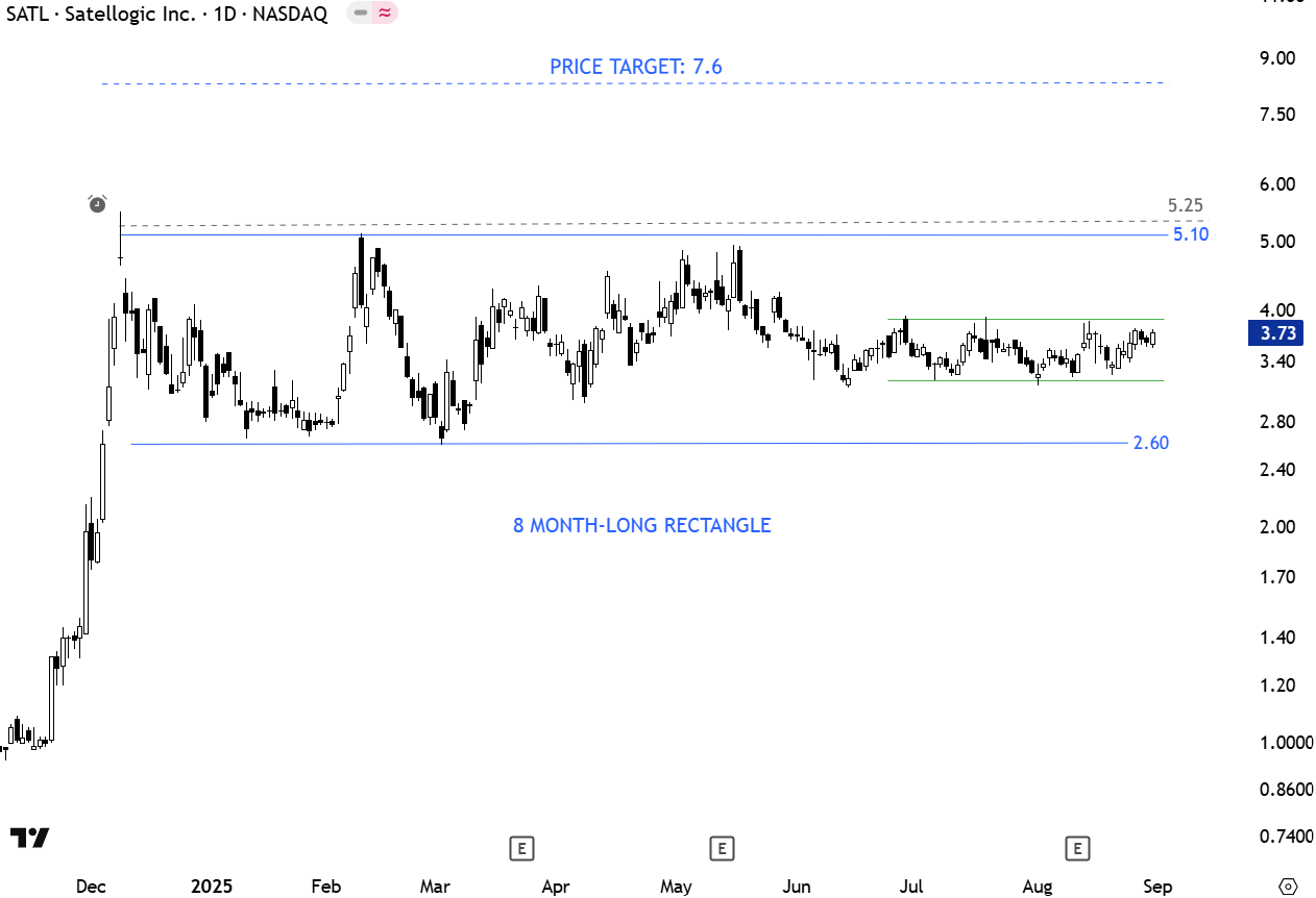 Satellogic Inc. is a vertically integrated geospatial analytics company. It is building a fully automated Earth Observation (EO) platform with the ability to remap the entire planet at both high-frequency and high-resolution, providing accessible and affordable solutions for its customers. The stock is listed on the Nasdaq Stock Exchange. Price chart formed a 6 month-long rectangle with the horizontal boundary acting as strong resistance at 5.10 levels. The horizontal boundary was tested several times over the course of the chart pattern. A daily close above 5.25 levels will confirm the breakout from the 6 month-long rectangle with the possible chart pattern price target of 7.60 levels. (Learn more: Video Tutorial)