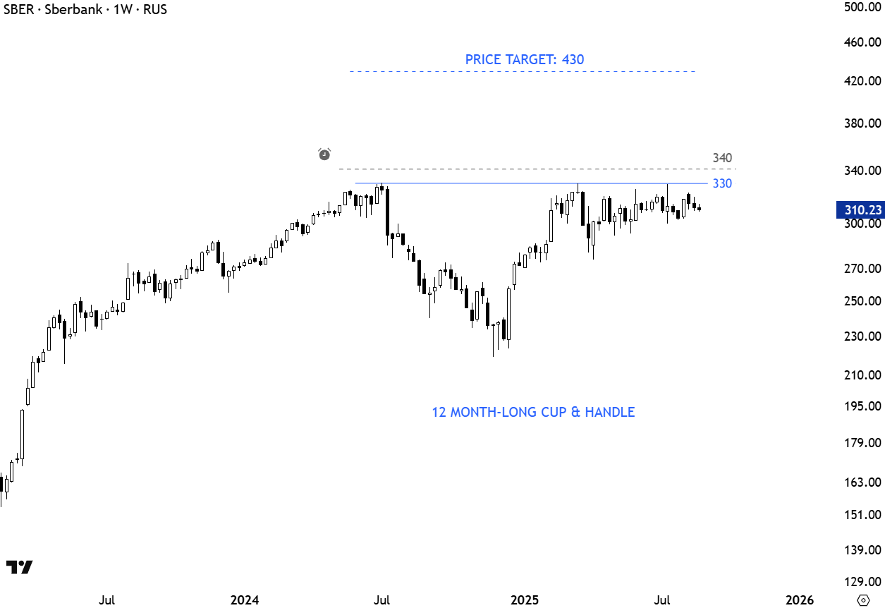 Sberbank, headquartered in Moscow, Russia, is the largest bank in Russia and one of the leading financial institutions in Eastern Europe. Majority-owned by the Russian government through the National Welfare Fund, it provides retail banking, corporate banking, investment services, and digital financial products. The stock is possibly forming a 12 month-long cup & handle continuation chart pattern with the horizontal boundary acting as resistance at 330 levels. A daily close above 340 levels will confirm the breakout with the possible chart pattern price target of 430 levels. (Learn more: Video Tutorial)