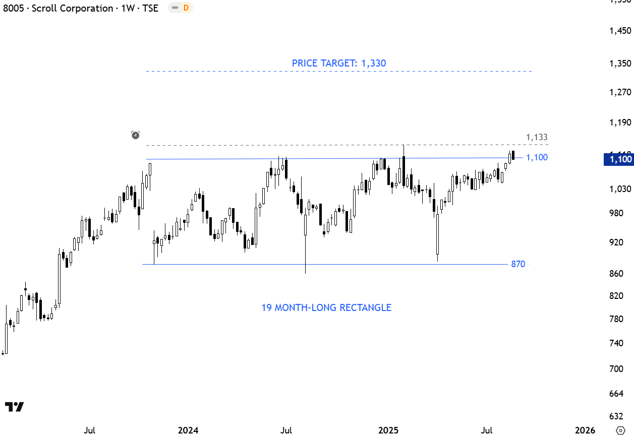 Scroll Corporation, headquartered in Japan, operates in the retail and e-commerce sectors, focusing on mail-order and online sales of apparel, cosmetics, and household goods. It also provides logistics and marketing services. The company has approximately 920 employees and is known for its catalog and online retail platforms. The stock is listed on the Tokyo Stock Exchange. Price chart formed a 19 month-long rectangle with the upper boundary acting as resistance at 1,100 levels. A daily close above 1,133 levels will confirm the breakout from the rectangle with the price target of 1,330 levels. (Learn more: Video Tutorial)