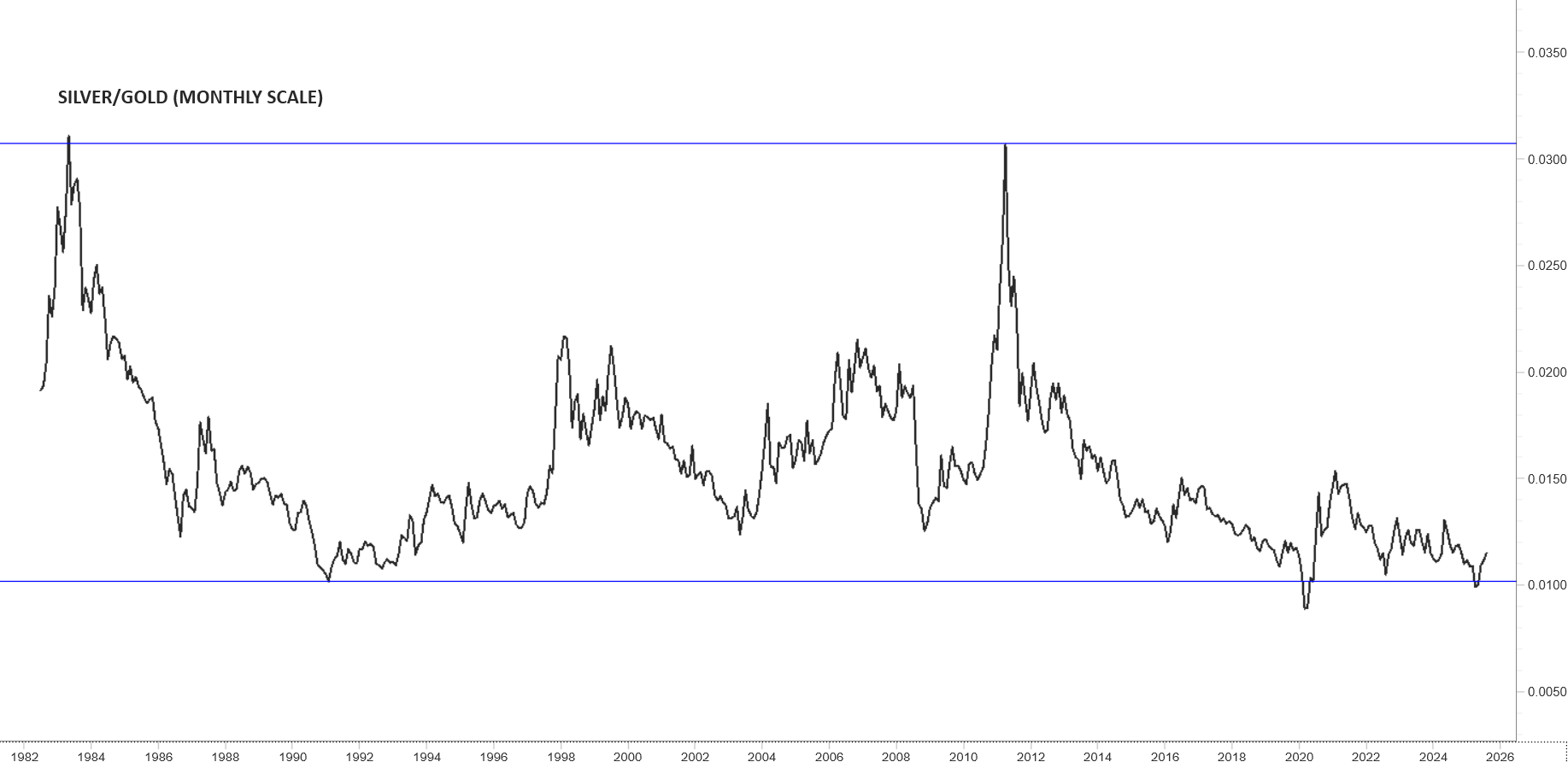 The chart below shows the historical SILVER/GOLD ratio. The ratio after reaching its historical resistance in 2011, is now rebounding from the long-term support. If any outperformance for Silver is going to take place, it is from current levels…