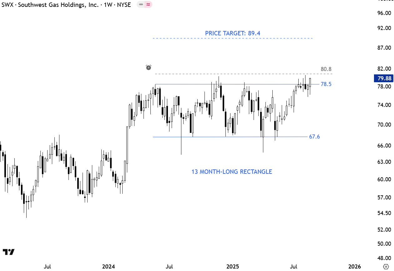 Southwest Gas Holdings, Inc. (NYSE: SWX) is a utility company engaged in the distribution of natural gas across the United States. The stock has formed a 13-month-long rectangle pattern, that can act as continuation pattern. The horizontal upper boundary with several tests acts as a resistance around the 78.5 levels, with support near 67.6. A daily close above 80.8 will confirm the breakout, potentially triggering a move toward the price target of 89.4. (Learn more: Video Tutorial)