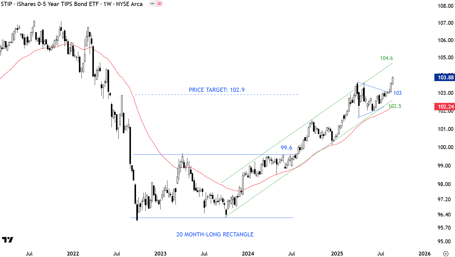 The I-SHARE 0-5 YR TIPS BOND ETF seeks to track the investment results of an index composed of inflation-protected U.S. Treasury bonds with remaining maturities of less than five years. It seeks to protect against near-term inflation. Price chart completed a 20 month-long rectangle with the upper boundary acting as resistance at 99.6 levels. Q2 2024 consolidation right below the resistance was a preparation for a breakout higher. Breakout in August 2024 confirmed the rectangle as bottom reversal with the price target of 102.9 levels. Price target was met. Uptrend is intact, though, price reversed from the upper boundary of its trend channel. The lower boundary of the trend channel acted as support at 102.5 levels. Inflationary pressures remain intact. Developing chart pattern completed as a symmetrical triangle that is now resuming the uptrend inside the channel. Continued strength can target the upper boundary of the channel at 104.6 levels.