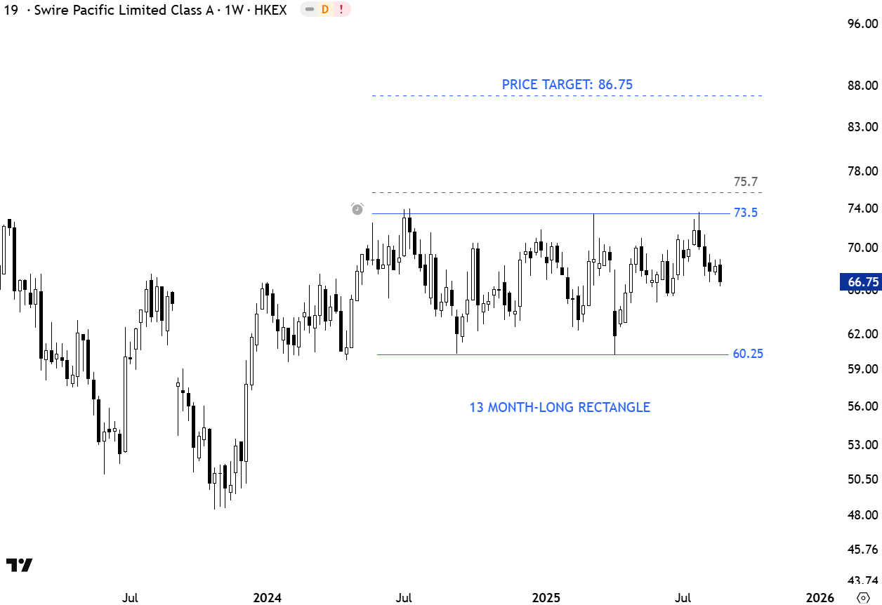 Swire Pacific (HKEX: 19) is a conglomerate engaged in property, aviation, beverages, and trading across Asia. The stock has formed a 13-month-long rectangle pattern that can act as a continuation chart pattern. The horizontal upper boundary acts as a resistance around 73.5 levels, with support near 60.25. A daily close above 75.7 will confirm the breakout, potentially triggering a move toward the price target of 86.75. (Learn more: Video Tutorial)