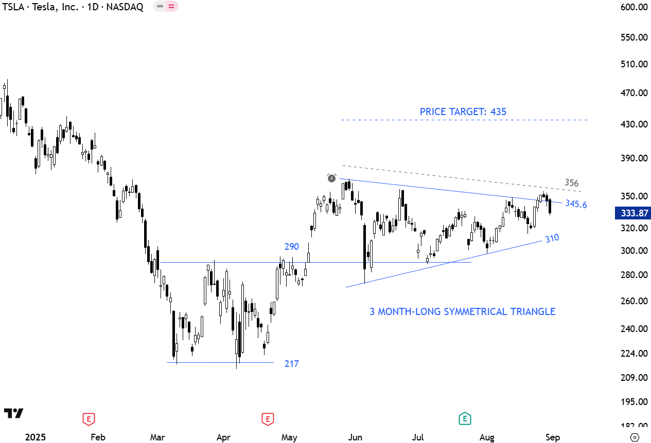 Tesla, Inc. engages in the design, development, manufacture, and sale of electric vehicles and energy generation and storage systems. The company operates through Automotive and Energy Generation and Storage. The Automotive segment includes the design, development, manufacture, sale, and lease of electric vehicles as well as sales of automotive regulatory credits. The Energy Generation and Storage segment is involved in the design, manufacture, installation, sale, and lease of stationary energy storage products and solar energy systems, and sale of solar energy systems incentives. The stock is listed on the Nasdaq Stock Exchange. Price chart is possibly forming a 3 month-long symmetrical triangle with the upper boundary acting as resistance at 345.6 levels. A daily close above 356 levels will confirm the breakout from the symmetrical triangle with the price target of 435 levels. (Learn more: Video Tutorial)