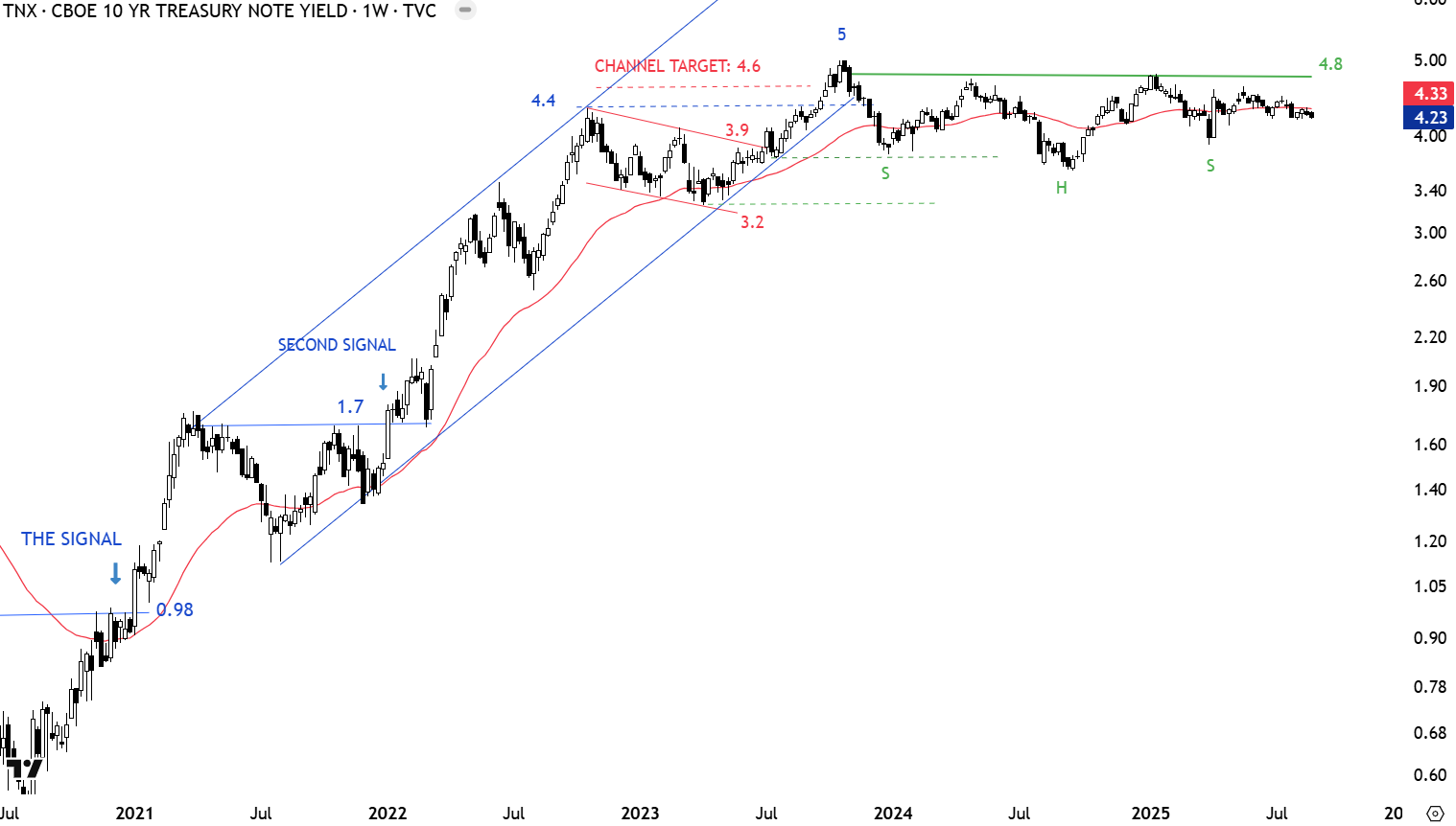4.8-5.0 area is the strong resistance formed by the horizontal neckline and the high at 5.0 levels. Wide trading range is between 3.5 and 5.0 levels. A possible H&S continuation might be forming with the neckline at 4.8 levels. Breakout above 4.8 can resume the uptrend on 10 year yields. Yields remain elevated and suggest inflation is still a concern. The H&S continuation can fail in the case of a breakdown below the low of the right shoulder at 3.9 levels.