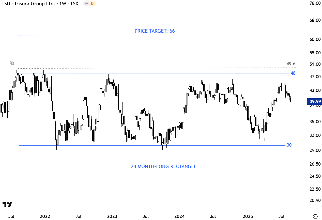 Trisura Group Ltd. is a specialty insurance provider. The Company is engaged in operating in surety, risk solutions, corporate insurance, and fronting business lines of the market. The stock is listed on the Toronto Stock Exchange. Price chart formed a 24 month-long rectangle with the horizontal boundary acting as strong resistance at 48.00 levels. The horizontal boundary was tested several times over the course of the chart pattern. A daily close above 49.60 levels will confirm the breakout from the 24 month-long rectangle with the possible chart pattern price target of 66.00 levels. (Learn more: Video Tutorial)