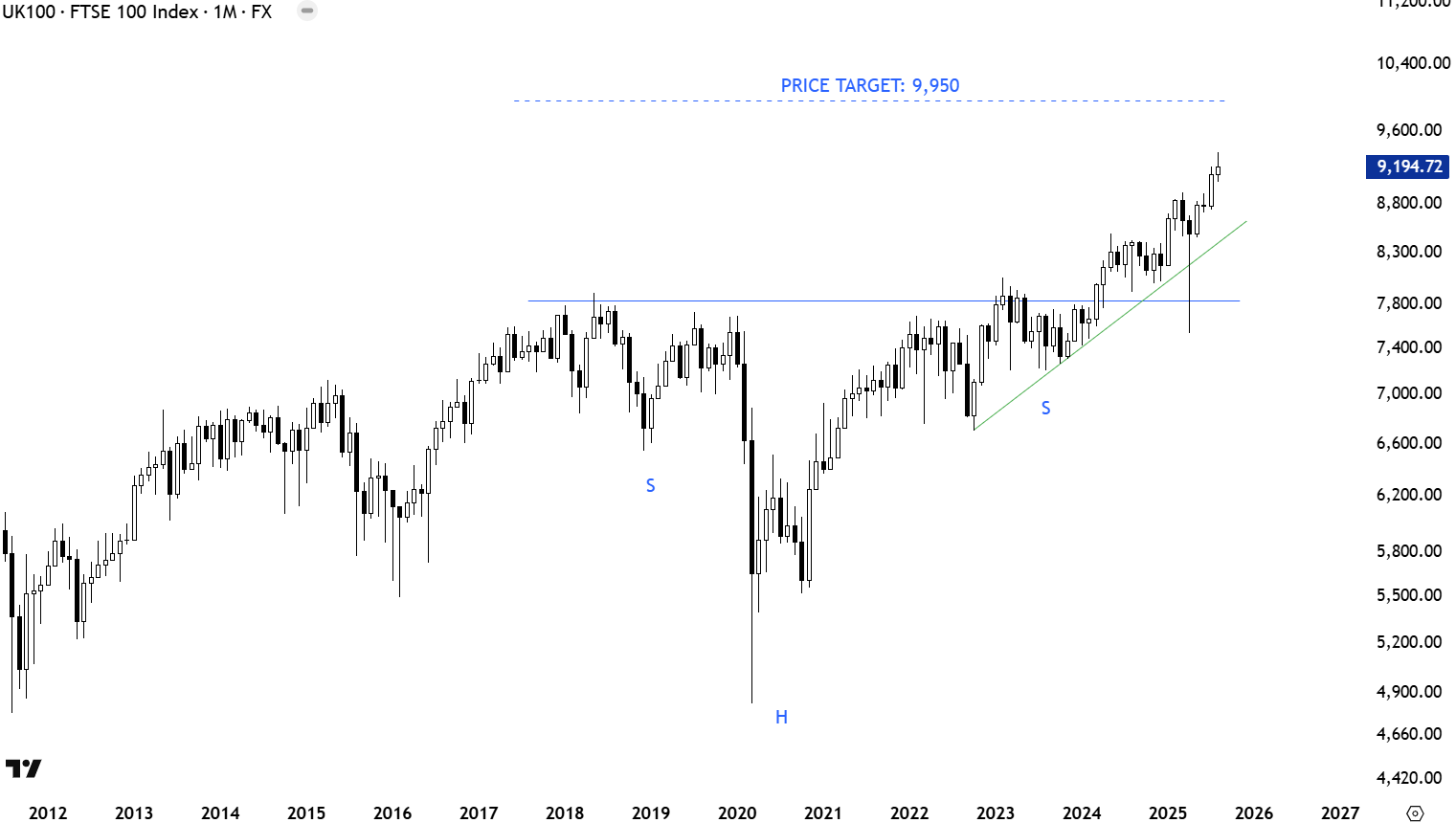 The long-term price chart of UK FTSE 100 Index completed a multi-month long H&S continuation chart pattern. The horizontal resistance was the neckline at 7,750 levels. This is a monthly scale price chart. Outlook is still positive for UK equities. 7,750 levels continue to be an important support. Uptrend is accelerating towards price objective at 9,950 levels.