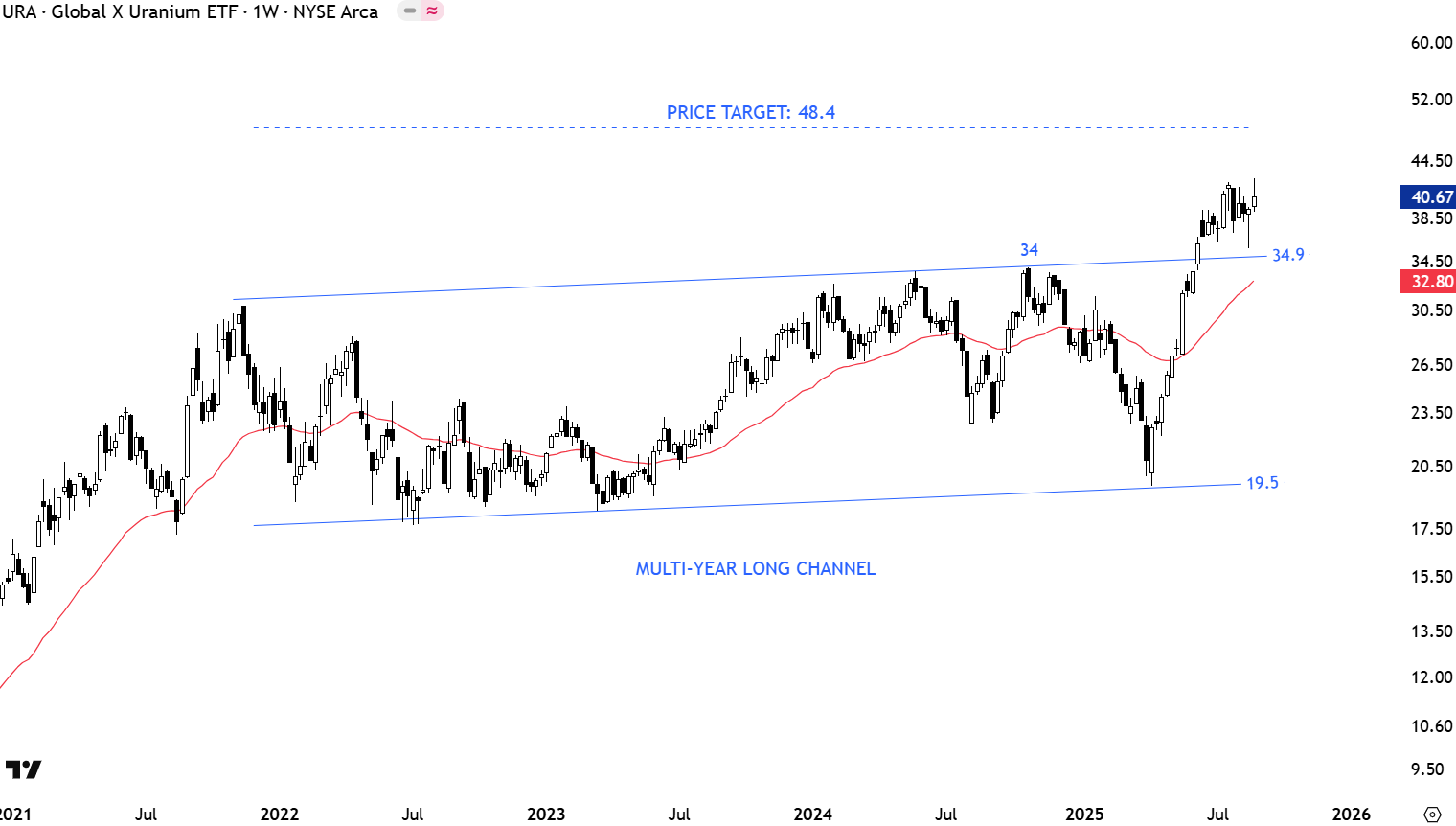 Global X Uranium ETF (URA) is possibly completing a larger scale ascending triangle or a channel. The price is breaking out of its wide trading range between 19.5 and 34.9 levels. Breakout above 34-34.9 area completed a multi-year long ascending triangle (or channel) with the price target of 48.4 levels. 34-34.9 area turns into support. This week’s long lower shadow shows buyers stepping around support. Polarity principle of previous resistance turning into support can be seen from the current price action.