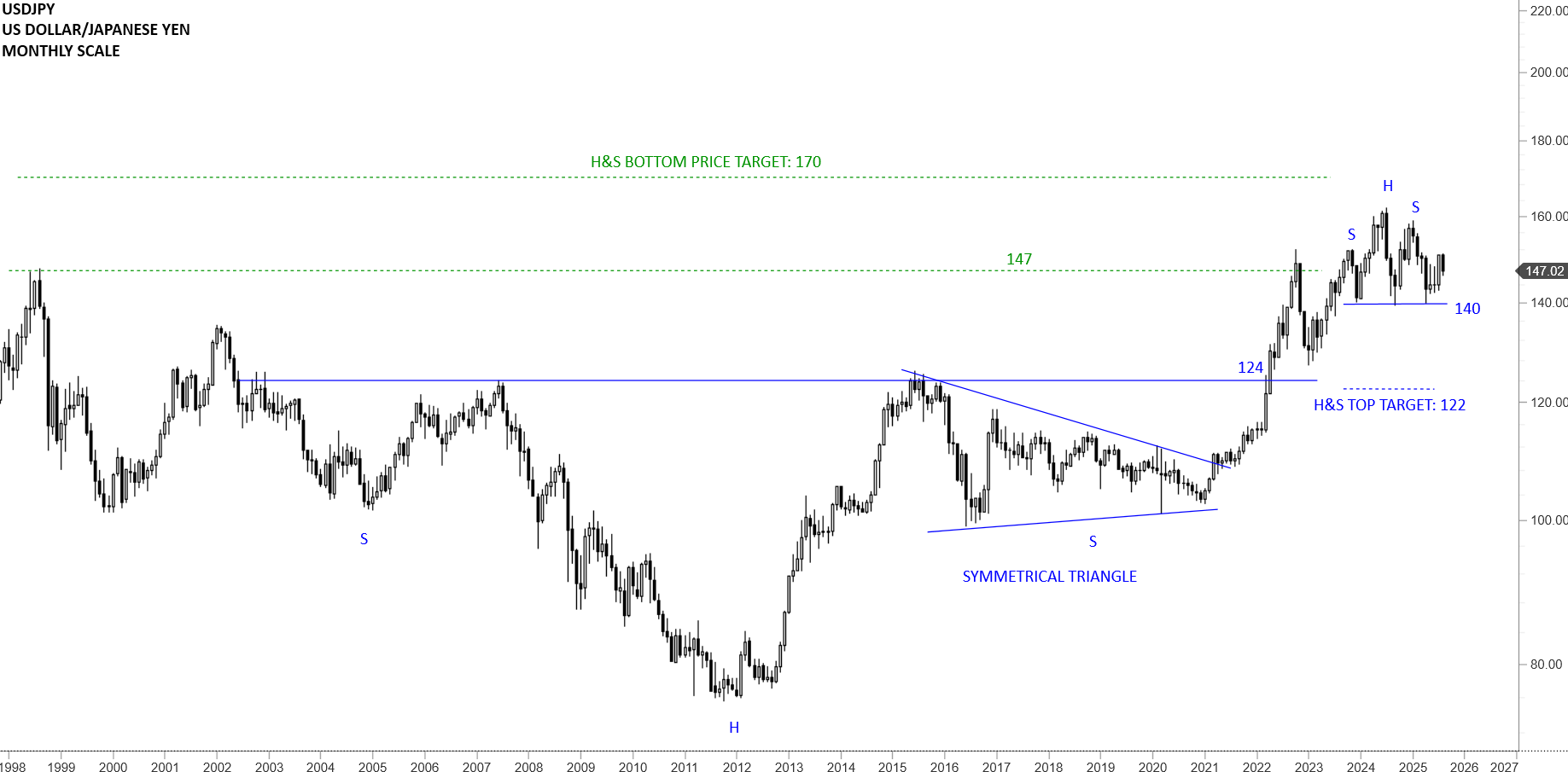 USDJPY completed multi-year long bottom reversal with a breakout above 124 levels. Long-term price action can be analyzed as a steady uptrend with higher highs and higher lows. 140 levels continue to act as support. Wide range remains between 140 and 162 levels. Re-test of 140 levels can better define a H&S top with the neckline at 140. Breakdown below 140 levels can complete the H&S top with the price target of 122 levels. Monthly chart shows a rebound from the lows at 140. While the chart pattern is clearly a H&S top, there is still no breakdown confirmation.
