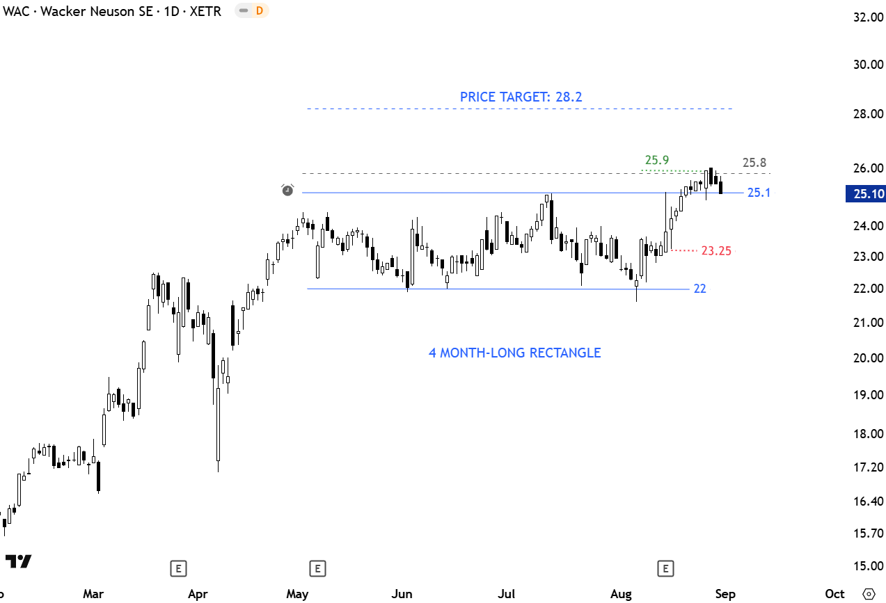 Wacker Neuson SE, founded in 1848 and headquartered in Munich, Germany, is a global manufacturer of light and compact construction equipment. Listed on the SDAX, the company operates under brands including Wacker Neuson, Kramer, Weidemann, and Enar, offering products such as rammers, vibratory plates, excavators, wheel loaders, and telehandlers. Price chart is possibly forming a 4 month-long rectangle with the upper boundary acting as resistance at 25.1 levels. The daily close above 25.8 levels confirmed the rectangle as a bullish continuation with the price target of 28.2 levels. (Learn more: Video Tutorial)