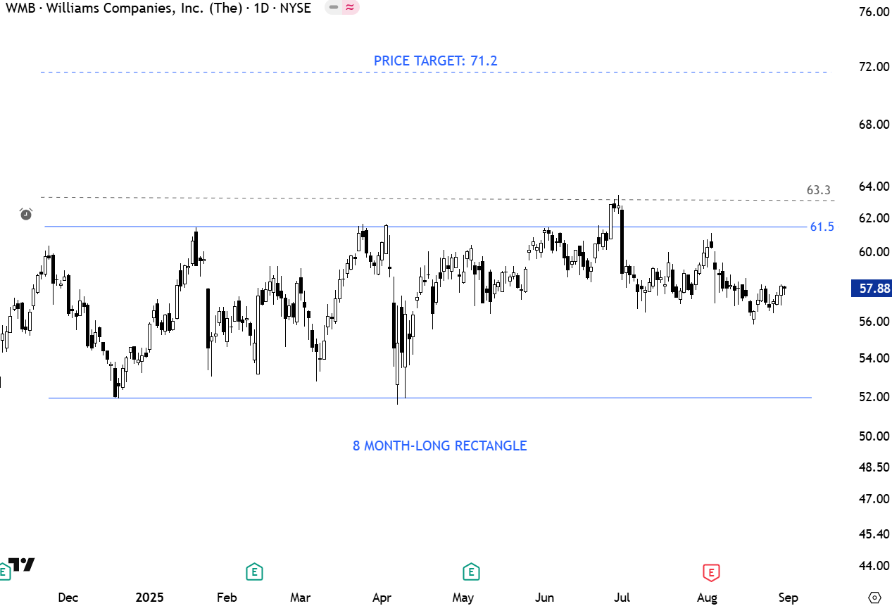 The Williams Companies, Inc. is an energy company. Its segments include Transmission & Gulf of America, Northeast G&P, West, and Gas & NGL Marketing Services. The stock is listed on the New York Stock Exchange. Price chart formed a 5 month-long rectangle with the horizontal boundary acting as strong resistance at 61.50 levels. The horizontal boundary was tested several times over the course of the chart pattern. A daily close above 63.30 levels will confirm the breakout from the 5 month-long rectangle with the possible chart pattern price target of 71.20 levels. (Learn more: Video Tutorial)