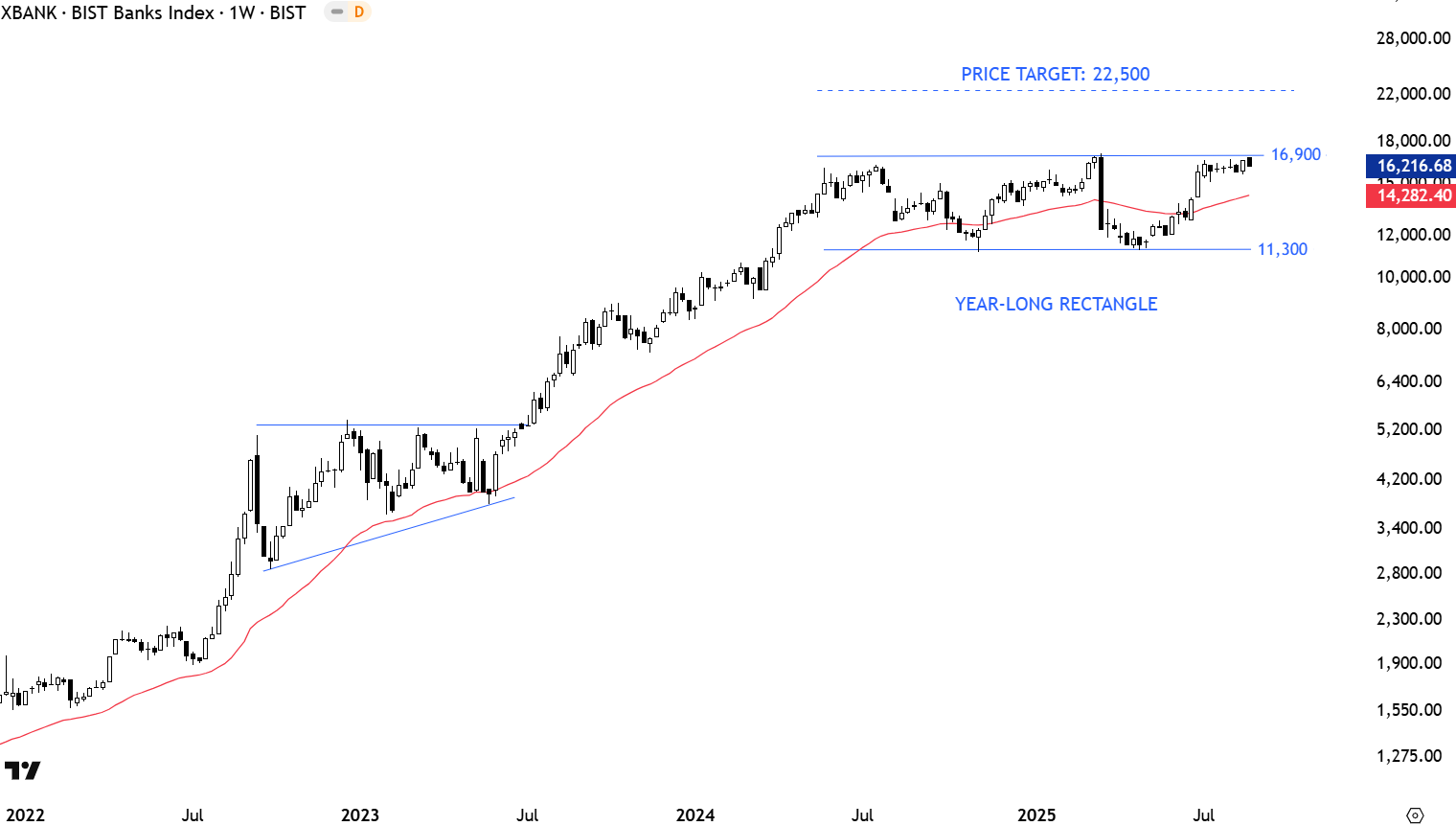 One of the better looking setups and an important chart pattern development is taking place on Turkiye BIST Bank Index. The year-long rectangle has a horizontal upper boundary at 16,900 levels. Breakout can complete the rectangle as a bullish continuation with the price target of 22,500 levels. Breakout on the Banking index can add momentum to the overall market and result in upward acceleration in both benchmarks.