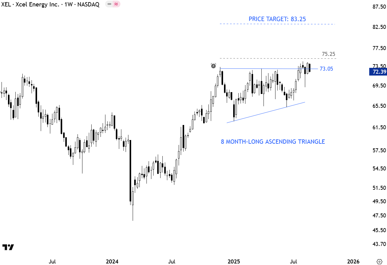 Xcel Energy Inc. (NASDAQ: XEL) is a regulated U.S. utility serving electricity and natural gas customers across eight states in the Midwest and West. Headquartered in Minneapolis, Minnesota, it operates through subsidiaries including Northern States Power (Minnesota & Wisconsin), Public Service Company of Colorado, and Southwestern Public Service in Texas and New Mexico. The stock formed an 8 month-long ascending triangle with the horizontal upper boundary acting as resistance at 73.05 levels. A daily close above 75.25 levels will confirm the breakout from the bullish continuation chart pattern with the price target of 83.25 levels. (Learn more: Video Tutorial)