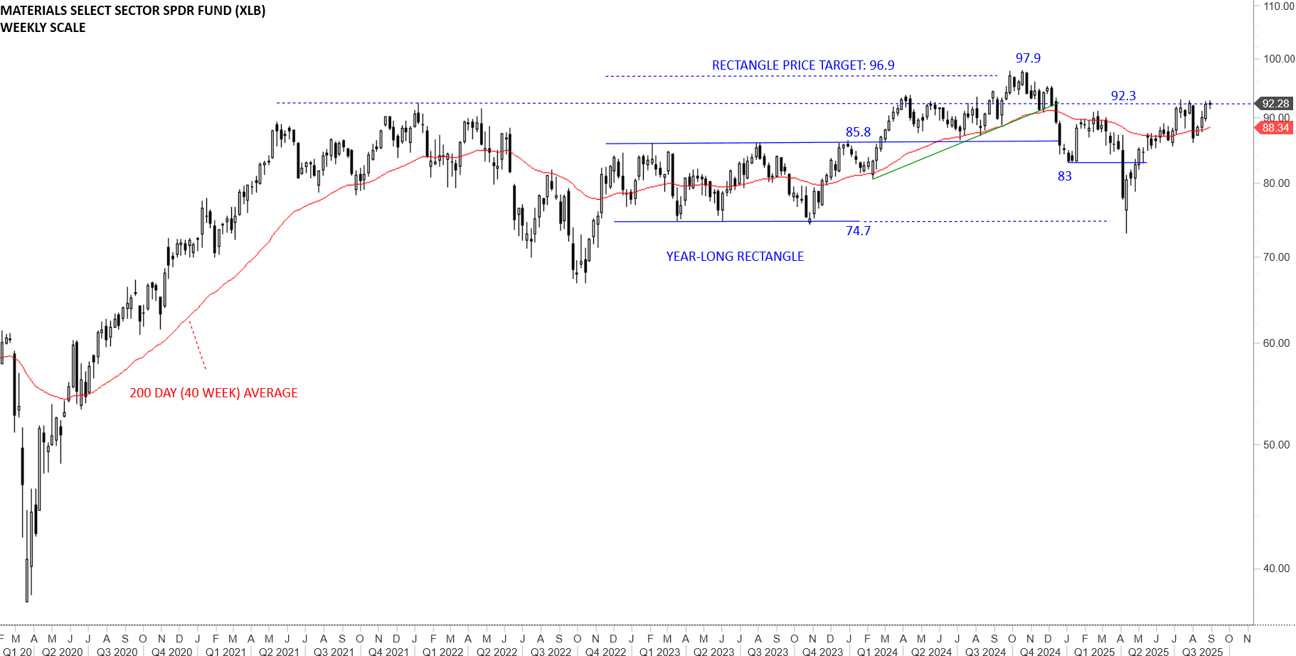 SPDR Materials Select Sector ETF (XLB) recovered above the long-term average and tested the 92.3 levels. This week’s price action found resistance at the horizontal boundary at 92.3. 92.3-97.9 area will act as resistance. It will be important for the price to settle above the year-long average in the following weeks for the uptrend to resume. A possible H&S bottom reversal with an upward sloping neckline can complete with a breakout above 92.3 levels.