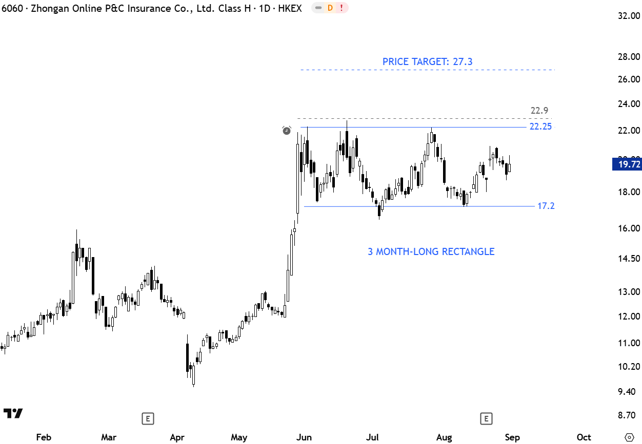ZhongAn Online P&C Insurance Co. Ltd. engages in the provision of insurance services. It operates through the following segments: Insurance, Technology, Banking, and Others. The stock is listed on the Hong Kong stock exchange. Price chart formed a 3 month-long rectangle with the upper boundary acting as resistance at 22.25 levels. Both boundaries were tested several times. A daily close above 22.9 levels will confirm the breakout with the possible chart pattern price target of 27.3 levels.