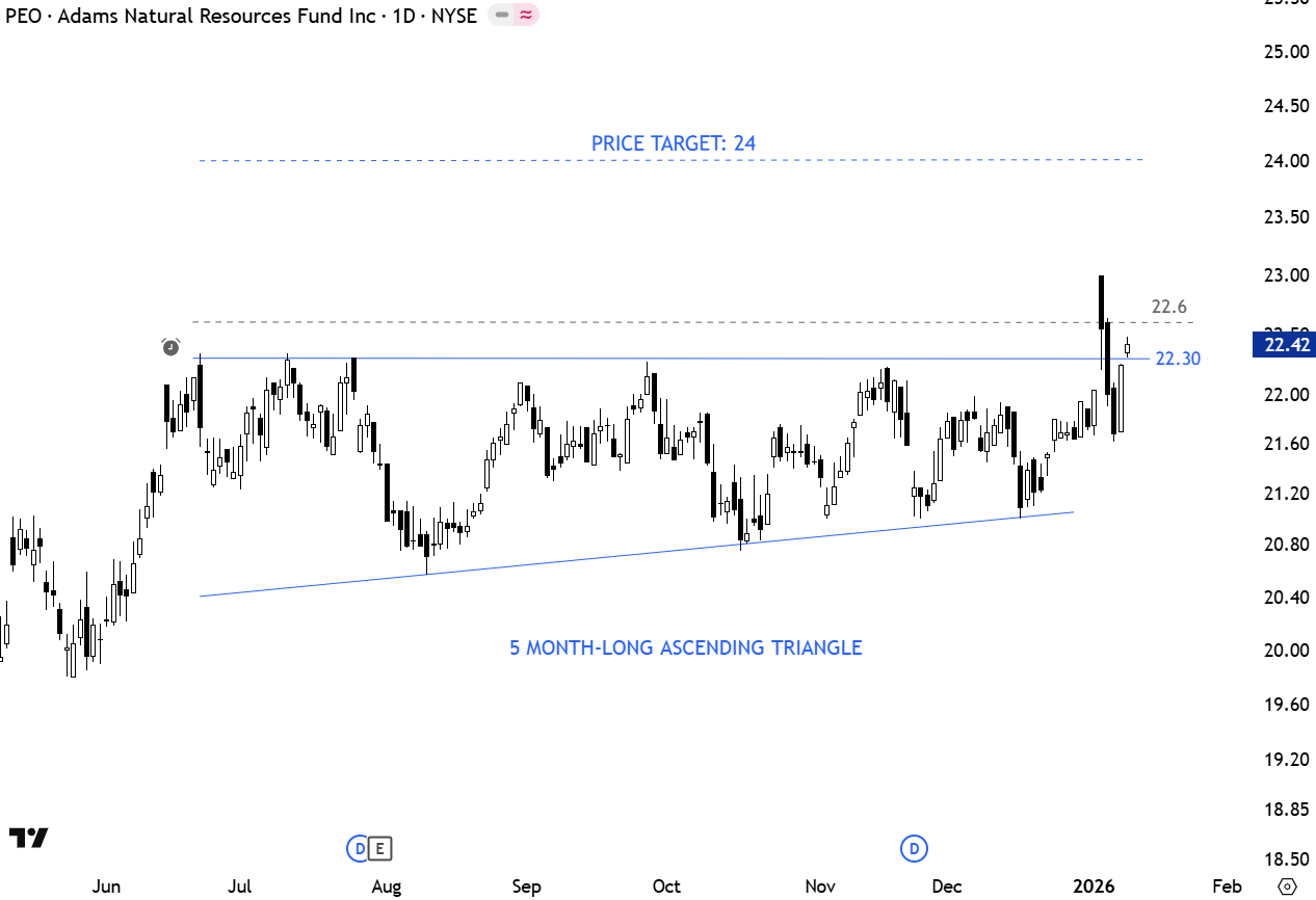 Adams Natural Resources Fund, Inc. is a closed-end equity investment fund, which specializes in energy and natural resources stocks. Its objectives include the preservation of capital, attainment of reasonable income from investments, and an opportunity for capital appreciation. The fund is listed on the New York Stock Exchange. Price chart formed a 5 month-long ascending triangle with the upper boundary acting as resistance at 22.30 levels. A daily close above 22.6 levels (half of 3% Edwards & Magee breakout confirmation guideline) will confirm the breakout from the bullish continuation chart pattern with the price target of 24 levels. (Learn more: Video Tutorial)