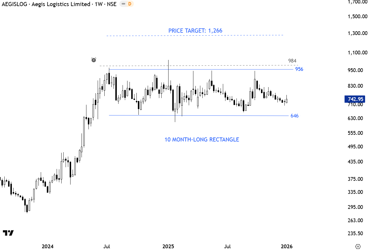 Aegis Logistics Limited is an India-based integrated oil, gas and chemical logistics company. The Company is engaged in the business of the import and distribution of liquified petroleum gas (LPG) and storage and terminalling facilities for LPG and chemical products. The stock is listed on the National Stock Exchange. Price chart formed a 10 month-long rectangle with the horizontal boundary acting as strong resistance at 956.00 levels. The horizontal boundary was tested several times over the course of the chart pattern. A daily close above 984.00 levels will confirm the breakout from the 10 month-long rectangle with the possible chart pattern price target of 1,266.00 levels. (Learn more: Video Tutorial)